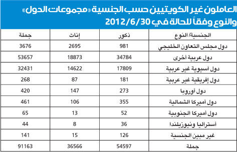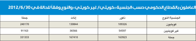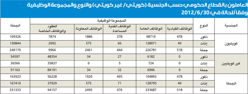 وبينت الإحصاءات أن المواطنات يستأثرن بـ55 في المئة من الوظائف الحكومية، وهي النسبة عينها تقريباً للعاملات في الجهات الحكومية من المواطنات وغير المواطنات.وتتميز فئات المواطنين العاملين في الجهات الحكومية بأنها شابة من أعمار يتراوح متوسطها بين 20 و40 سنة، وهي نسبة تشمل زهاء 89 في المئة من الموظفين، الذين يمتاز نحو 42 في المئة منهم بحيازتهم شهادات جامعية.تركزت الجهود الحكومية خلال الأعوام القليلة الماضية، في معرض معالج مشكلة البطالة في البلاد، على زيادة المستوى التوظيفي للمواطنين في القطاع الحكومي بشكل أساسي، إضافة إلى زيادة معدلات «التكويت» في القطاع الخاص.وفي محاولة لتبيان حجم العمالة الوطنية في القطاعين الحكومي والخاص، باعتباره العنصر الأساسي للتوجهات الحكومية في التعامل مع قضايا العمالة، أجرت الإدارة المركزية للإحصاء إحصاء للعاملين في الجهات الحكومية أذاعت نتيجته العام الجاري تبين بنتيجته خلال عام 2012 أن عدد العاملين في القطاع الحكومي بلغ 331333 مشتغلا منهم 240 ألف كويتي بنسبة 72.5 في المئة، علما بأن هذه النسبة تتغير بين جهة حكومية وأخرى، فضلا عن أن القسم الأكبر من المواطنين يعمل في وزارتي التربية والصحة.واستناداً إلى الإحصائية فقد بلغ حجم العمالة في القطاع الحكومي وفقاً لإحصاءات العام الماضي 331333 مشتغلا منهم 240170 كويتيا بنسبة 72.5 في المئة، ومن جهة أخرى بلغ عدد الذكور منهم 163923، منهم 109326 كويتيا بنسبة 66.7 في المئة، بينما بلغ عدد الإناث 167410 منهن 130844 كويتية بنسبة 78.2 في المئة.وتشير النتائج إلى أن حجم العمالة في الوزارات والإدارات العامة الحكومية التي تضم 26 جهة بلغ 263497 مشتغلا منهم 191924 كويتيا بنسبة 72.8 في المئة، وقد استحوذت وزارتا التربية والصحة على أكثر من نصف جملة العاملين نحو 55.0 في المئة، حيث بلغ عدد العاملين بوزارة التربية 97604 بنسبة 37.0 في المئة، بينما بلغ عدد العاملين بوزارة الصحة 47326 مشتغلا بنسبة 18.0 في المئة، أما عن نسبة الكويتيين العاملين بهما فقد بلغت 67.3 في المئة، 45.0 في المئة، في كل منهما على التوالي.أما في ما يتعلق بحجم العمالة في المؤسسات والهيئات الحكومية ذات الميزانيات الملحقة التي تضم 13 جهة فقد بلغ 27834 مشتغلا، منهم 23103 كويتيين بنسبة 83.0 في المئة.ويلاحظ أن نحو 79.0 في المئة من جملة العاملين بهذه الجهات يعملون في الجهات الأربع التالية: بلدية الكويت، وجامعة الكويت، والهيئة العامة للتعليم التطبيقي والتدريب، والإدارة العامة للإطفاء.وبلغت نسبة الكويتيين إلى جملة العاملين بهذه الجهات الأربع 83.4 في المئة، و66.9 في المئة، و88.5 في المئة، و98.8 في المئة على التوالي.أما حجم العمالة في المؤسسات والهيئات الحكومية ذات الميزانيات المستقلة التي تضم 14 جهة فبلغ 14157 مشتغلا منهم 10569 كويتيا بنسبة 74.7 في المئة.واحتلت مؤسسة الخطوط الجوية الكويتية المرتبة الأولى، حيث يعمل بها 3926 مشتغلا، بنسبة 27.7 في المئة، تليها المؤسسة العامة للرعاية السكنية، حيث استحوذت على 1596 مشتغلا بنسبة 11.3 في المئة، أما في ما يتعلق بنسبة الكويتيين لإجمالي العاملين في كل منهما فقد بلغت 50.2 في المئة في الأولى و67.1 في المئة في الثانية.وتشير النتائج أيضاً إلى أن حجم العمالة في الشركات المملوكة للدولة ملكية كاملة التي تضم 15 شركة بلغ 25845 مشتغلا منهم 14574 كويتيا بنسبة 56.4 في المئة.هذا، ويلاحظ ان نحو 70.2 في المئة من جملة العاملين في هذه الشركات يعملون في الشركات الثلاث التالية: شركة نفط الكويت، وشركة البترول الوطنية الكويتية، وشركة النقل العام الكويتية.وتجدر الإشارة إلى أن هناك اختلافات كبيرة في نسبة الكويتيين لإجمالي العاملين في الشركات الثلاث، حيث ترتفع نسبتهم ارتفاعا كبيرا في شركة البترول الوطنية الكويتية حوالي 83.2 في المئة، وتنخفض قليلاً في شركة نفط الكويت، حيث تبلغ 74.5 في المئة، بينما تنخفض نسبتهم انخفاضا كبيرا في شركة النقل العام الكويتية، اذ لم تتجاوز نسبتهم 5.0 في المئة من جملة العاملين بالشركة.معدلات الأعمارمن واقع