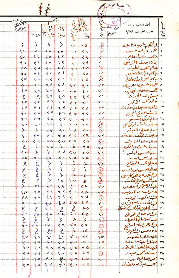(الصفحة الثانية): مبارك سلطان السداني، محمد صالح العلي، مساعد سلطان المرزوق، مهنا محمد السهلي، مساعد سالم العلي، محمد يعقوب المنيفي، ناصر جمعة الحسينان، ناصر عبدالله المسعود، يوسف عبدالوهاب البابطين، يوسف محمد الضاعن، يوسف عبدالله القصيمي، عبدالله حسن... شريدة، محمد عيسى قعود، خالد خاصر المسيعيد، عباس إبراهيم حسن، إبراهيم صالح الوزغ، عبدالوهاب الشهاب، عبدالرحمن إبراهيم الرخيص، إبراهيم عبدالله خلاوي، عبدالعزيز راشد الوهيب، حسن عبدالصمد حسن، حمد إبراهيم الحمود، يعقوب حسين العلي، عبداللطيف محمد الفايز، جاسم محمد السند، علي حسن أحمد، محبوب... أحمد الوزان، إبراهيم مجيد البراهيم، يوسف خليفة الخليفة، عبدالرحمن عبدالكريم ماضي، محمد حبيب المناور، محمد حماد الزويران، فوزان عبدالله الرجيبة، سليمان علي الشايجي، عبدالله الشويلان، خالد خليل العوضي، مهنا صالح الطبيخ، مطلق مزيد المسعود، محمد داود شعيل.ونلاحظ في الورقتين أن بعض الدرجات كانت منخفضة، وعليها دوائر حمراء، ما يدل على رسوب أصحابها. في خاتمة هذا المقال نقول إن الملا سالم الحسينان أصيب بمرض في أواخر حياته، وتوفي في عام 1976، وله من الأبناء محمد ويوسف وعبدالله، وابنة واحدة توفيت رحمها الله.