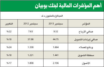 أعلن بنك بوبيان تحقيق صافي ربح حتى نهاية سبتمبر 2013 قدره 9.3 ملايين دينار، بزيادة قدرها 22% عن الفترة ذاتها من العام الماضي، بربحية سهم بلغت 5.1 فلوس. وقال نائب رئيس مجلس الإدارة الرئيس التنفيذي للبنك عادل الماجد: "مرة اخرى نؤكد ان البنك يسير في الاتجاه الصحيح نحو تحقيق الاهداف الاستراتيجية التي سبق ان وضعها، والتي تهدف الى الحصول على رضا العملاء، من خلال تنويع خدماته ومنتجاته وخلق القيمة المضافة لهم". واكد ان خطط البنك اعتمدت على توسيع قاعدة الأعمال، والتركيز بصورة أعمق على النشاطات المصرفية الرئيسية بما تشملها من خدمات ومنتجات وحلول تمويلية تلبي كل احتياجات الأفراد والشركات، مشيرا إلى أن هذه التوجهات تزامنت مع المحافظة على جودة الأصول، وفاعلية سياسة إدارة المخاطر الائتمانية، ومواصلة السياسة المتحفظة في بناء المخصصات. واضاف: "ركزت استراتيجية العودة إلى أساسيات العمل المصرفي (2010-2014) على التوسع في السوق المحلي، من خلال الخدمات والمنتجات الموجهة للأفراد والشركات، فبالنسبة للخدمات انصبت الجهود على محورين؛ الأول: رفع عدد الفروع المحلية أو إعادة توزيع خريطة انتشار بعضها، بحيث تكون على مقربة من العملاء، والثاني: التوسع في طرح منتجات جديدة وغير مسبوقة". التوسع الجغرافي وشدد الماجد على أن "هذا التوجه ينطلق من حقيقة ان نمو الأرباح التشغيلية لأي بنك مرتبط بمدى القدرة على التواصل مع العملاء"، مشيرا إلى أن الفروع لاتزال تشكل الوسيلة الأنسب لهذا التواصل. واضاف ان البنك افتتح مؤخرا فرعه في منطقة الرقعي، ليرتفع عدد فروعه الى 25 فرعا، متوقعا ان يبلغ عدد فروع البنك في نهاية العام المقبل المستهدف في الاستراتيجية الخمسية للبنك (2010 – 2014) 35 فرعا. وكان البنك خلال الاشهر التسعة الاخيرة قد افتتح مجموعة من الفروع، من بينها فرع مدينة سعد العبدالله، حيث كان "بوبيان" اول بنك محلي يفتتح فرعا له في هذه المدينة الكبيرة. وعن المنتجات اوضح الماجد أنه "بالنظر إلى المنافسة المحتدمة في السوق المصرفي المحلي، كان لابد من التركيز على إطلاق منتجات جديدة وغير مسبوقة تتماشى مع تطلعات ورغبات عملائنا". وتقدم بالشكر الى جميع مساهمي البنك وعملائه وموارده البشرية للدور الذي قاموا به جميعا في دعم البنك في مرحلته الانتقالية الاخيرة، حيث ساهمت جهودهم في النجاحات التي حققها البنك. مؤشرات إيجابية من ناحية اخرى، استعرض الماجد عددا من أهم المؤشرات المالية الإيجابية للبنك، مؤكدا ان ابرز نمو إجمالي الاصول إلى 2.1 مليار دينار، بزيادة 17% عن نفس الفترة من العام الماضي، الامر الذي ما كان ليتحقق لولا الجهود التي بذلها جميع العاملين في البنك. واضاف ان من المؤشرات الايجابية ايضا زيادة صافي إيرادات التمويل لتصل إلى 45 مليون دينار بنهاية سبتمبر 2013 مقارنة بـ38 مليونا لنفس الفترة من عام 2012، وبنسبة نمو قدرها 18%، إضافة إلى زيادة ودائع العملاء إلى 1.7 مليار، مقارنة بـ1.3 مليار لنفس الفترة من العام السابق بنسبة نمو قدرها 24%. كما ارتفع إجمالي قيمة حقوق الملكية في البنك ليصل إلى 258 مليون دينار، مقارنة بـ250 مليونا، والذي ترتب عليه أن بلغ معدل كفاية رأسمال البنك 22.2%. وزاد ان من المؤشرات الإيجابية أيضا ارتفاع محفظة التمويل إلى 1.4 مليار دينار، مقارنة بـ1.2 مليار في نهاية سبتمبر من العام الماضي، وبنسبة نمو 18%، إلى جانب الارتفاع المتواصل لقاعدة عملاء البنك. وأشار إلى ما حققه البنك خلال الفترة الماضية من العام الحالي من إنجازات مميزة بحصوله على 11 جائزة إقليمية وعالمية، ابرزها جائزة افضل بنك اسلامي صاعد من مجلة غلوبل فاينانس العالمية، وجائزة افضل بنك اسلامي في الكويت للعام الرابع على التوالي من اريبيان بيزنس، وجائزة أفضل بنك إسلامي في الكويت لخدمة العملاء للعام الثالث على التوالي من مؤسسة سيرفس هيرو، وجائزة اسرع البنوك نموا من مجلة بانكر الشرق الاوسط للعام الثاني على التوالي، وجائزة أفضل بنك كويتي في المسؤولية الاجتماعية من أكاديمية تت