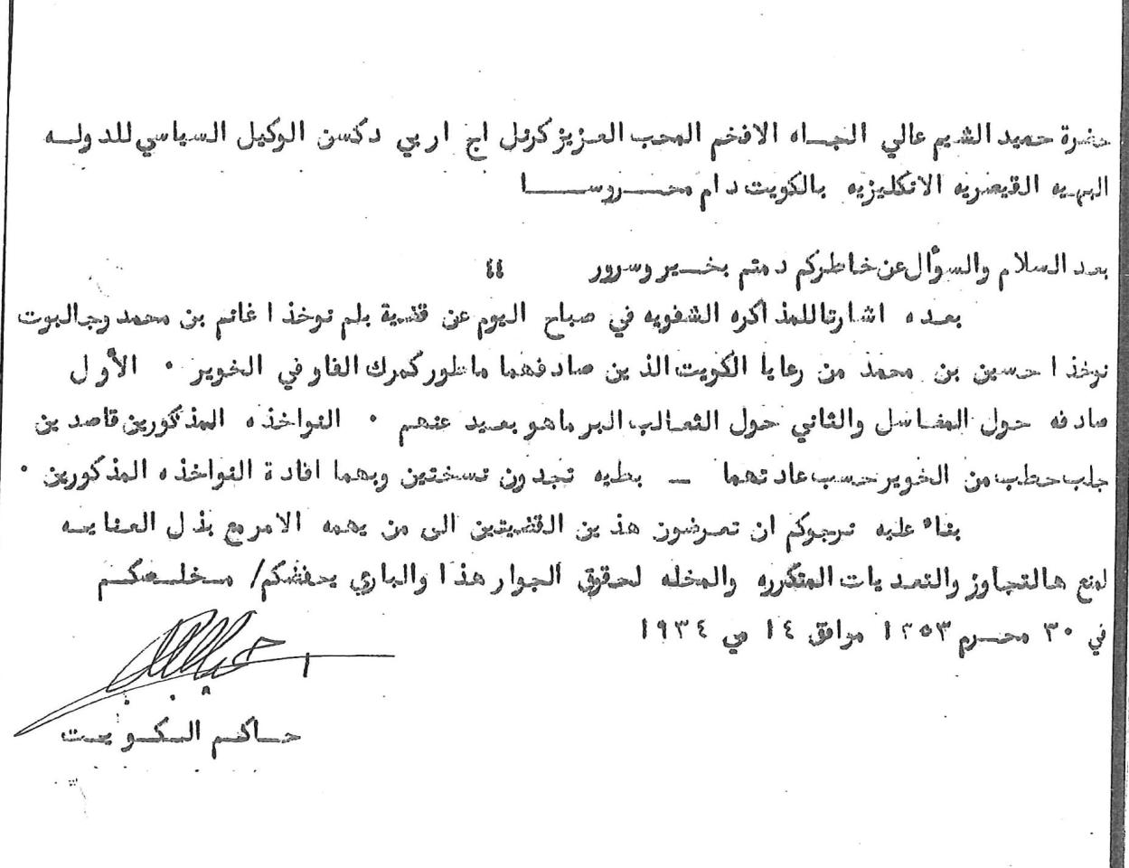 بعد السلام والسؤال عن خاطركم دمتم بخير وسرور،،، بعده إشارتا للمذاكرة الشفوية في صباح اليوم عن قضية بلم (سفينة صغيرة) نوخذا غانم بن محمد وجالبوت نوخذا حسين بن محمد من رعايا الكويت الذين صادفهما ماطور كمرك الفاو في الخوير. الأول صادفه حول المغاسل، والثاني حول الثعالب، البر ما هو بعيد عنهم. النواخذة المذكورين قاصدين جلب حطب من الخوير حسب عادتهما -بطيه تجدون نسختين وبهما إفادة النواخذة المذكورين. بناء عليه نرجوكم أن تعرضون هذين القضيتين إلى من يهمه الأمر مع بذل العناية لمنع هالتجاوز والتعديات المتكررة والمخلة لحقوق الجوار. هذا والباري يحفظكم. في 30 محرم 1353 موافق 14 مي 1934مخلصكم أحمد الجابر حاكم الكويت" أما إفادة النوخذة غانم بن محمد فقد ورد فيها إنه كان في منطقة المغاسل بالقرب من الخوير لجلب الحطب، وفي الصباح الباكر اقترب منهم زورق عراقي، وبدأ يطلق النار باتجاههم بدون سبب، مما دفعهم إلى ركوب سفينتهم، والاتجاه نحو الزورق العراقي، وبعد الاقتراب من العراقيين، صاح بهم رئيسهم بأن يتوقفوا، وأخذوا ينهالون عليهم بالشتائم، وركب بعض العراقيين في سفينة النوخذة غانم وأخذوا يفتشونها بحثاً عن السكر، فلم يجدوا شيئاً، فتركوا الكويتيين، وذهبوا. وإليكم نص الإفادة كما ورد:"إني غانم بن محمد قد توجهت من الكويت إلى الخوير لأجل جلب الحطب وقد وصلنا المغاسل بتاريخ 3 محرم 1353 موافق 18 ابريل 1934، وبعد طلوع الشمس ظهر علينا ماطور كمرك الفاو من بعيد، وأطلق علينا ثمان طلقات بدون سبب، ونحن خشية القتل خطفنا بالشراع وتوجهنا إلى ناحية الماطور لحتى لا يطلق علينا أكثر. ولما وصلنا قريبا من الماطور أمر علينا أن نطرح وجعلوا يشتمونا جميعهم، وقد كان بالماطور سبع أنفار أكثرهم مسلح، وقلنا لهم ايش السبب في إطلاقكم الرصاص علينا وشتمنا بدون سبب، فجعلوا يكررون الشتم بكلام بذيء. وقالوا ان عندكم شكر، فقلنا لهم هذه سفينتنا فتشوها فإذا وجدتم شيئ فلكم الحق، وعندها ركب واحد منهم إلى البلم واسمه سيد ابراهيم وأظن انه كبيرهم ومعه رجل ثاني اسمه عبدالرسول وفتشوا البلم وعندما علموا وتيقنوا أن البلم أولا خراب وفيه ماي ووجدوا كِسّار حطب كثير قالوا لا باس انتم مرخوصين. فقط نريد منكم أن تخبرونا عن إذا يوجد سفن فيها شكر قلت أنا رجل فقير ومهنتي اجلب حطب من الخوير الى الكويت واذا احد يودي كر ما اعلم فيه. وفي الأخير عندنا صندوق صغير فتحوه، ووجدو فيه خبز فأخذوه وارخصونا... هذه صورة القضية.صحيح غانم بن محمد"وبخصوص إفادة النوخذة حسين بن محمد فهي كالتالي:"اني نوخذا حسين بن محمد توجهت من الكويت في جالبوت معي نفرين بحرية قاصدين الخوير في ليلة 5 محرم 1353 وفي يوم خامس منه وصلنا جزيرة وربة وبتنا فيها والصبح خطفنا قاصدين الثعالب. وقبل طلوع الشمس في قليل جانا رمي من بعيد وسمعنا حس ماطور، وبعد قليل تكرر علينا الرمي حتا عرفنا ان هذا ماطور كمرك الفاو، واخذ يرمي علينا بدون حساب، وخفنا ونزلنا في البر متضرين في جنب الجالبوت ولا فاد ولا بطل الرمي علينا وخفنا شي يصيبنا من الرصاص، تركنا الجالبوت وسبحنا وأخذت ارفع لهم يدي من بعيد اشرلهم لا ترمون ولا فاد. بعد ذلك طبقوا الجالبوت واقلصوها خاطفة بشراعها، وحنا سبحنا حتى ظهرنا على الثعالب، وانحدرنا نمشي نبي أهل الصبية حتا ينقذونا من الهلاك. صار واحد من البحرية تعبان بسبب السباحة، وتعطلنا معه مدة قليلة حتا استرحنا، وبعدين مشينا ومن لطف الله حصلنا راعي بلم خالي ياخذ حطب، وركبنا معهم واستقمنا عندهم احد عشر يوم لما قطعوا الحطب. وطلعنا وياهم الى الصبية وافقنا ضربة الشمال الذي جانا فيها المطر وتعطلنا في الصبية. هذا صورة الجاري علينا من سبب ماطور كمرك الفاو. صحيح وإقرار حسين بن محمد"