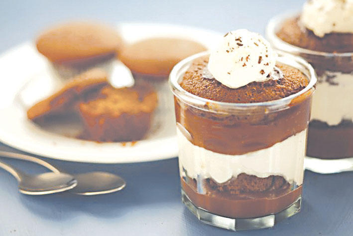 بارفيه بالكاب كيك بنكهة الشوكولا (6 أشخاص)الطريقة-1 اخلطي كوباً من الكريما المخفوقة مع ملعقة أو ملعقتين كبيرتين من السكر لتليين الزوايا القاسية.-2 قطّعي رأس قطع الكاب كيك الست بالعرض، مباشرةً تحت الجزء العلوي الذي يتّصل بقطعة الحلوى.-3 اختاري 6 أكواب تكون واسعة بما يكفي لتسع رؤوس قطع الكاب كيك. بدل استعمال أكواب البارفيه التقليدية، استعملي أكواب شرب مستقيمة على الجانبين.الطبقة-1 اسكبي حوالى ربع كوب من بودينغ الشوكولا في قعر كل كوب.-2 ضعي الجزء السفلي من قطع الكاب كيك في البودينغ وادفعيها بنعومة كي يخرج البودينغ من وسط أطراف الكاب كيك.-3 غطسي كل قطعة بكمية وافرة من الكريما المخفوقة وادفعيها نحو الأسفل حول جوانب الكاب كيك وغطي سطح كل قطعة.-4 ادهني فوقها طبقة من البودينغ بحجم نصف إنش.-5 ضعي فوقها رؤوس الكاب كيك.-6 كخطوة أخيرة، أضيفي كمية البودينغ والكريما المخفوقة. سيكون برش الشوكولا السوداء خياراً جيداً أيضاً.-7 في حال تحضير خليط البارفيه قبل يوم، ادهني البودينغ على الطبقة العليا لكن لا تضيفي الكمية الأخيرة من الكريما المخفوقة (غطي الكريما المخفوقة وبرّديها). غطي خليط البارفيه وبرّديه. عندما تصبح الحلوى جاهزة، أعيدي خلط الكريما بخفاقة يدوية. أضيفي الكريما المخفوقة على قطع البارفيه وقدميها.ملاحظة: تصبح قطع البارفيه أشهى عند تحضيرها قبل يوم من إعداد الوصفة.بودينغ بالشوكولا غير المحلاة (4 أشخاص)مدة التحضير: 15 دقيقة.مدة الخَبز: 18 دقيقة.مدة التبريد: 30 دقيقة.المقادير- كوب لكل قطعة: كريما ثقيلة، حليب كامل الدسم.- بيضة مخفوقة.- ربع كوب مع ملعقتين كبيرتين من السكر.- ملعقتان كبيرتان لكل قطعة: بودرة الكاكاو غير المُحلّى، نشاء الذرة.- 1/8 ملعقة صغيرة من الملح.- ملعقتان كبيرتان مع ملعقة صغيرة من الزبدة غير المملّحة. - 85 غراماً من برش الشوكولا غير المحلاة.الطريقة-1 اسكبي الكريما والحليب والبيض في قدر متوسط. في وعاء آخر، اخلطي السكر والكاكاو ونشاء الذرة والملح. أضيفي الخليط إلى القدر. سخني المقادير حتى تغلي وحركيها باستمرار على حرارة مرتفعة. اسكبي البودينغ في وعاء. أضيفي إليه الزبدة والشوكولا حتى تذوبان.-2 اسكبي البودينغ في وعاء زجاجي كي يبرد. استعملي غلافاً بلاستيكياً فوق سطح البودينغ. ضعيه في الثلاجة إلى أن يبرد، مدة 30 دقيقة تقريباً.في الحصة: 521 سعرة حرارية، 41 غراماً من الدهون، 25 غراماً من الدهون المشبعة، 153 ملغ من الكولسترول، 39 غراماً من الكربوهيدرات، 8 غرامات من البروتينات، 141 ملغ من الصوديوم، 3 غرامات من الألياف.كاب كيك بالشوكولا (18 قطعة)مدة التحضير: 20 دقيقةمدة الخَبز: 18 دقيقةملاحظة: يحدد الكاتب نيك مالغيري كيفية تحويل أي وصفة من وصفات الحلوى في كتابه “Bake!” إلى قوالب كاب كيك. تطبق هذه الوصفة تلك التوجيهات على الكعكة بالزبدة والشوكولا. يوصي مالغيري بتغطية سطح القوالب برذاذ الطبخ أو الزبدة كي لا يلتصق سطح الكاب كيك عند تمدده (تذكري أننا نريد أن يتوسّع سطح البارفيه بما يكفي). هذه التوجيهات خاصة بخلاط كهربائي، لكن يمكن خلط مزيج الحلوى طبعاً بخلاط يدوي.المقادير- كوبان من الطحين.- 3 ملاعق صغيرة من مسحوق الخبيز.- ربع ملعقة صغيرة من الملح.- 12 ملعقة كبيرة من الزبدة غير المملحة والمذوبة.- كوب ونصف الكوب من السكر.- ملعقتان صغيرتان من الفانيلا.- 3 بيضات كبيرة على درجة حرارة الغرفة.- 85 غراماً من الشوكولا غير المحلاة والمذوبة والمبرّدة.- ثلاثة أرباع كوب من الحليب الكامل الدسم على درجة حرارة الغرفة.الطريقة-1 سخني الفرن على حرارة 350 درجة. وزعي قوالب ورقية في صواني المافن. اخلطي الطحين ومسحوق الخبيز والملح معاً في وعاء. ضعي الخليط جانباً.-2 اخلطي الزبدة والسكر في وعاء الخلاط الكهربائي. اخفقي الخليط بسرعة متدنية إلى أن يمتزج جيداً. زيدي السرعة إلى درجة متوسطة. اخفقي الخليط إلى أن يصبح خفيفاً ولونه باهتاً، مدة 5 دقائق تقريباً. أضيفي الفانيلا.-3 أضيفي البيض بشكل تدريجي واخفقي الخليط جيداً بعد كل بيضة، ثم أضيفي الشو