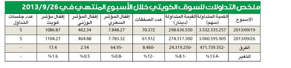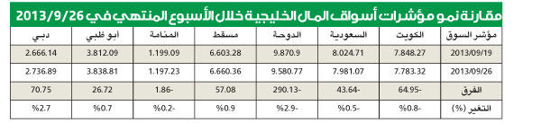 تباين أداء مؤشرات اسواق المال الخليجية كمحصلة لتداولات الاسبوع الماضي حيث أضافت 3 مؤشرات نقاطا جديدة لمؤشراتها، بينما فقدت 4 اسواق نقاطا، وكان الاداء متفاوتا ولكن بنسب محدودة.واستمرت الصدارة للاسبوع الثالث على التوالي لمؤشر سوق دبي المالي الذي واصل ارتداده رابحا 2.7 في المئة تلاه سوق مسقط بمكاسب قاربت 1 في المئة ثم جاره أبوظبي محققا 0.7 في المئة، بينما على الطرف الآخر خسر مؤشر الدوحة حوالى 3 في المئة متذيلا الاداء بفارق كبير بين بقية الاسواق الخاسرة التي لم يتجاوز اي منها نسبة 1 في المئة وهي الكويت السعودية والبحرين.دبي تكسب 16% في 3 أسابيعواصل مؤشر سوق دبي المالي الذي سجل الاداء الافضل خلال النصف الاول من هذا العام بين مؤشرات الخليج وكان من بين افضل 3 اسواق عالميا، تحقيق المكاسب للاسبوع الثالث على التوالي مستعيدا كل خسائر أزمة سورية السياسية التي انتهت الى ترجيح كفة السلام على الحرب وجمع خلال ثلاثة اسابيع فقط 16 في المئة، حيث كان الاسبوع الماضي الاقل مرتفعا بنسبة 2.7 في المئة ليتباطأ نموه تدريجيا ولكنه يبقى في المنطقة الخضراء والأكثر نموا في المنطقة ليقفل عند مستوى 2736.89 نقطة مضيفا 70.75 نقطة جديدة، وكانت الاسهم العقارية في بداية الاسبوع الداعم الاول للمؤشر تلتها بعد ذلك اسهم المصارف وبعض الاسهم الخدمية.وتأثر سوق أبوظبي ايجابا بتداولات سوق دبي حيث حقق ارتفاعا لكنه اقل بنسبة 0.7 في المئة ليقفل عند مستوى 3838.81 نقطة ليضيف ما يعادل 26.72 نقطة الى مؤشره، مسجلا الارتفاع الاسبوعي الثالث على التوالي كحال مؤشر دبي.واستطاع مؤشر سوق مسقط أن يلحق بركب الرابحين بعد بطئه الاسبوع ما قبل الماضي حيث لم يقدم اداء مماثلا لبقية الاسواق الخليجية وبقيت مكاسبه دون 1 في المئة مما اعطاه فرصة جديدة في الاسبوع الماضي ليضيف حوالي نقطة مئوية جديدة بعكس الاداء الاحمر لمعظم الاسواق الخليجية بالغا مستوى 6660.36 نقطة بعد أن اضاف 57.08 نقطة.قطر... اكتتابات تاريخية حقق مؤشر سوق الدوحة تراجعا كبيرا خلال الاسبوع الماضي قارب 3 في المئة بعد ضغط عمليات بيع استعدادا للمساهمة في اكبر اكتتابات هذا العام، والاكتتاب عام لمواطني قطر في شركات البترول القطرية الحكومية التي ستطرح اسهما بقيمة 880 مليون دولار، واكبها توجه للسماح بالاقتراض باعلى من المعدلات المسموح بها لمواطني الدولة لتغطية الاكتتاب وبفائدة اقل من سعر الفائدة الرسمي، ولا شك ان مثل هذا الطرح سيضيف قيمة جديدة لسوق الاوراق المالية القطري ويعد فرصة استثمارية جيدة لتوظيف سيولة عالية في السوق المالي القطري.السعودية... مستوى 8 آلاف نقطةتخلى مؤشر «تداول» السعودي عن مستوى 8 آلاف نقطة مرة جديدة بعد معانقته اكثر من مرة خلال الاسبوع السابق ونهاية اغسطس الماضي. ورغم الاستقرار على خسائر محدودة خلال الاسبوع الماضي فانها كانت كافية لمغادرة مستوى 8 آلاف نقطة مرة اخرى والاقفال عند مستوى 7981.07 نقطة بعد حذف 43.64 نقطة هى نسبة نصف نقطة مئوية حمراء، ليبقى الترقب والانتظار لنتائج اعمال شركات السوق المدرجة الرئيسية والتي من المحتمل ان يحقق جزءا مهما منها نموا جيدا يدفع بالاسعار الى الافضل خصوصا في قطاعي المصارف والبتروكيماويات وهما القطاعان الاكبر في السوق السعودي الاكبر عربيا.وخسر مؤشر البحرين عشري النقطة المئوية بعد مكاسب كبيرة خلال الاسبوع السابق تجاوزت 2 في المئة وكانت عمليات جني ارباح محدودة قد عصفت بمؤشر مرفأ البحرين المالي محدود السيولة والنشاط قياسا ببقية الاسواق الخليجية.الكويتي... تباين المؤشراتتباين اداء مؤشرات سوق الكويت للاوراق المالية الرئيسية بنهاية تعاملاتها الاسبوعية كمحصلة اسبوعية حيث تراجع مؤشر السوق السعري 0.8 في المئة اي 64.95 نقطة ليقفل عند مستوى 7783.32 نقطة والتي جاءت جميعها خلال الجلسة الاخيرة وسجلت انزلاقا كبيرا على مستوى السعري بحوالي 120 نقطة، وفي المقابل حافظ مؤشرا السوق الوزنيان على مكاسب بداية الاسبوع بل اضافا نقطا جديدة في نهايته وعلى خلاف اداء الم
