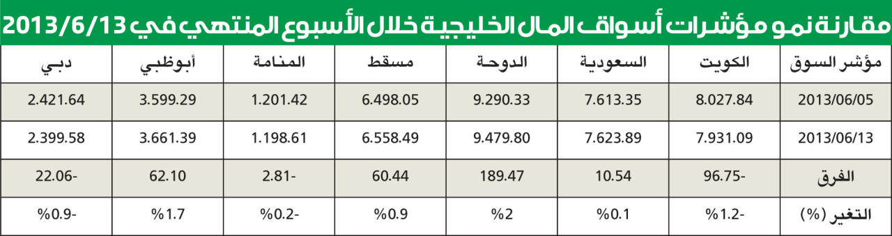 تباين اداء مؤشرات اسواق الخليج كمحصلة اسبوعية للاسبوع الماضي، وبعد سلسلة من التوافق والاداء المتماثل كان الاسبوع الثاني من شهر يونيو فاصلا في استمرار البعض في الارتفاع كسوقي أبوظبي وقطر، واستمرار تراجع السوق الكويتي للاسبوع الثاني على التوالي، ليكمل خسارة 4.5 في المئة خلال يونيو الحالي فقط، بعد ان اقفل على خسارة 1.2 في المئة الاسبوع الماضي، وتراجع كذلك سوقا دبي والمنامة، بينما ربح "مسقط" و"السعودي" مكاسب بنحو 1 في المئة للاول ومحدودة في مؤشر "تاسي" السعودي.ترقية مستحقةوسعت الجهات المختصة في قطر والامارات الى ترقية سوقي المنامة وابوظبي في مؤشر (MSCI) من سوقين مبتدئين الى ناشئين، وكان لها ذلك بعد ان تم رفضهما خلال الاعوام الثلاثة الماضية، بسبب شح سيولتهما ونقص بعض المتطلبات الخاصة بالترقية، والتي اهمها رفع نسبة تملك الاجانب وتطبيق الحكومة والشفافية.ورغم ان هذين السوقين ليسا الاكبر او الاقدم بين الاسواق الخليجية، لكنهما يملكان الرغبة والجدية في رفع مستوياتهما، بتذليل كل العقبات وتطبيق شروط "مورغان ستانلي" لترقيتهما الى مرتبة اسواق ناشئة، ما سيعطي لهما اهمية كأدوات استثمار عالمية خلال الفترة المقبلة.وبفضل قرار الترقية استطاع السوقان ان ينهيا اسبوعهما على مكاسب خضراء هي الافضل خليجيا، حيث ربح سوق الدوحة 2 في المئة، مواصلا اقفالاته القياسية بالغا مستوى 9479.8 نقطة رابحا 189.47 نقطة جلها خلال جلسة الاربعاء بعد صدور القرار مباشرة.وعزز كذلك مؤشر سوق ابوظبي من مكاسبه السنوية، بعد ان اضاف اليها 1.7 في المئة، والتي تعادل 62.1 نقطة، ليصل الى مستوى 3661.39 نقطة، وهو كذلك مستوى قياسي لمؤشر الامارة الخليجية الغنية بالنفط، والتي يسجل مؤشرها تذبذبا محدودا منذ بداية العام وباتجاه صاعد دون تراجعات او انزلاقات واضحة.تراجع «دبي» و«السعودي»وعلى الطرف الآخر، انقذ قرار الترقية سوق دبي من خسارة كبيرة بعد مكاسبه خلال جلسة الاربعاء، والتي استعاد خلالها خسائر كبيرة حققها في اولى جلسات الاسبوع، لينهي اسبوعه على خسائر محدودة لم تتجاوز 0.9 في المئة فقط، اي 22.06 نقطة، ويبقى قريبا جدا من مستوى 2400 نقطة، لا يفصله عنه الا اقل من نصف نقطة فقط.ونجا السوق السعودي من تراجع محتمل بعد اقفاله عصر الاربعاء وبفترة كافية قبل افتتاح الاسواق الاميركية ثم الآسيوية، والتي حققت خسائر كبيرة، حيث كانت ايجابية بفارق ايام العمل بين السعودي والاسواق العالمية، والذي لا يلتقي معها الا في ثلاث جلسات فقط, ولحسن الحظ كذلك فإن الاسواق استطاعت ان تستعيد جزءا كبيرا من خسائرها خلال جلسة الخميس، وبالتالي انتفى اثر تراجعاتها على مؤشر "تاسي"، والذي سجل مكاسب محدودة خلال الاسبوع الماضي وبنسبة عشر نقطة مئوية فقط، اي 10.54 نقاط ليبلغ مستوى 7623.89 نقطة.مكاسب في مسقط وتراجع المنامةواستطاع مؤشر سوق مسقط ان يستمر في ادائه الايجابي، ويربح 0.9 في المئة، بعد ان انهى اسبوعه على مستوى 6558.5 نقطة، مضيفا 60.44 نقطة، مستمرا في اتجاهه الصاعد وبأداء متوازن نسبيا اذا قورن بأداء اسواق الخليج الكبرى مستفيدا من نمو اقتصادي جيد في سلطنة عمان.ولم يستطع سوق المنامة الصمود فوق مستوى 1200 نقطة، الذي اجتازه نهاية الاسبوع الاول من هذا الشهر، وخسره بعد ان انهى اسبوعه الماضي على خسارة 2.81 نقطة، اي ان عشري النقطة المئوية كانت كفيلة بكسره للمستوى المذكور، واستقراره عند مستوى 1198.61 نقطة، متأثرا بتراجع اسعار بعض اسهم قطاع البنوك وشركات الاستثمار رغم محدودية سيولتها.«الكويتي» واللون الأحمرولازم اللون الاحمر مؤشرات سوق الكويت للاوراق المالية، للاسبوع الثاني على التوالي، حيث خسر المؤشر السعري 1.2 في المئة خلال الاسبوع الماضي، لتصل خسائر اول اسبوعين من شهر يونيو 4.5 في المئة، ويقفل على مستوى 7931.09 نقطة، حاذفا 96.75 نقطة خلال الاسبوع الماضي.وسجل المؤشران الوزنيان خسائر اكبر، كانت 2.3 في المئة للمؤشر الوزني، ليقفل على مستوى 458.09 نقطة، مطيحا بنحو 10.73 نقاط من قيمته، وكانت الخسائر الاك