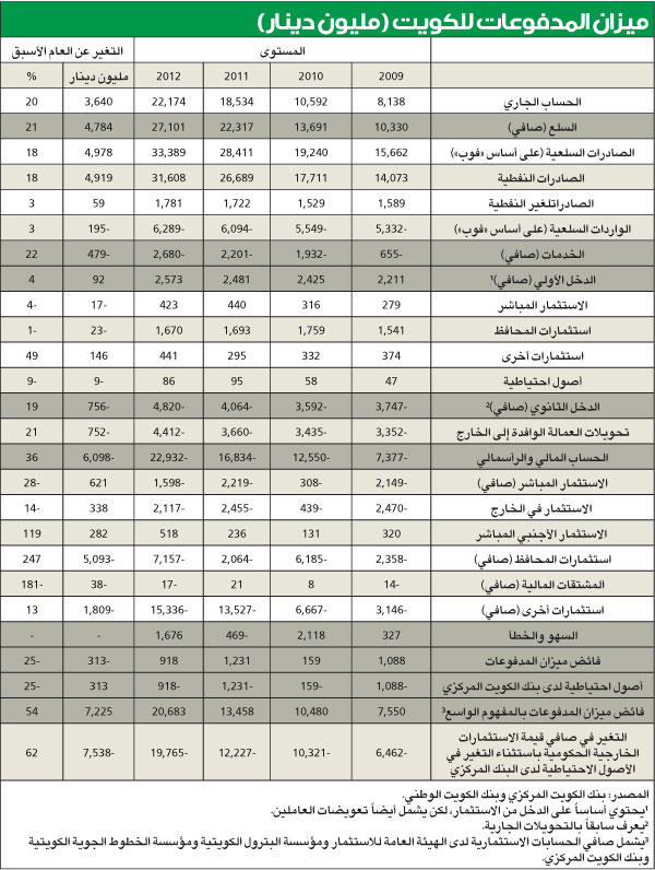 شهد الحساب الجاري الكويتي فائضا قياسيا بلغ 22.2 مليار دينار في 2012، ليتجاوز بذلك المستوى المسجل في 2011، والبالغ 18.5 مليارا، وتجاوز الفائض القياسي في الميزان السلعي العجز القياسي في الخدمات والتحويلات إلى الخارج.