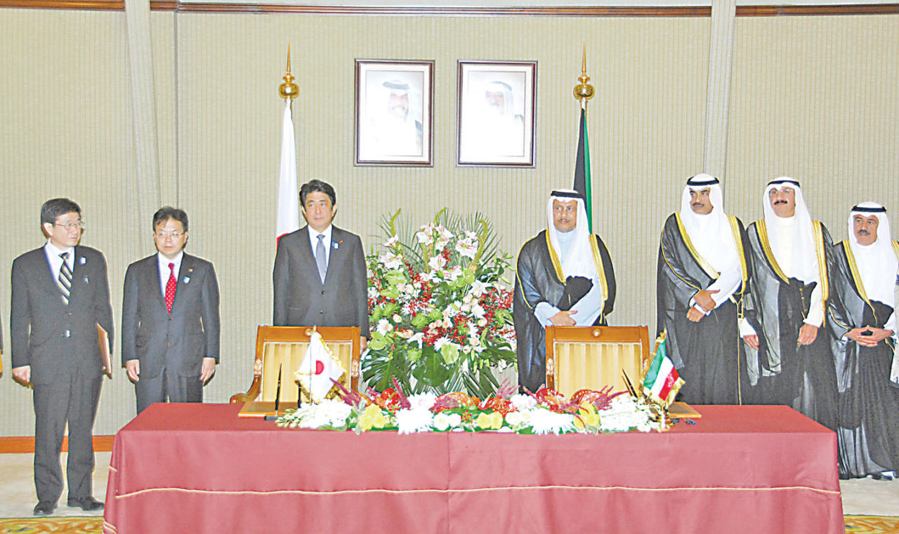وكان المبارك عقد ونظيره الياباني جلسة مباحثات رسمية في قصر بيان ليل امس الاول تناولت تعزيز وتنمية العلاقات الاقتصادية والتجارية والتعليمية اعقبها التوقيع على مذكرة تعاون بشأن الحوار السياسي في التنمية الوطنية بين البلدين ومذكرة تعاون في مجالات التعليم العالي والبحث العلمي.البيان المشتركوفي ختام المباحثات صدر بيان مشترك بين دولة الكويت واليابان استذكر في مستهله الجانبان زيارة الدولة من قبل سمو الامير الشيخ صباح الاحمد والبيان المشترك الصادر عن الزيارة في مارس 2012 ورحبا بالتقدم الملموس على مستوى التعاون الثنائي في المجالات السياسية والاقتصادية وكذلك التبادل الثقافي والتبادل على مستوى الاشخاص.واعرب رئيس الوزراء الياباني باسم بلاده عن تقديرها للمنح الكويتية السخية البالغة خمسة ملايين برميل من النفط الخام وثلاثة ملايين دولار الى اكوامارين فوكوشيما ومليوني دولار الى جمعية الصليب الاحمر الياباني بالاضافة الى مشاريع اعادة الاعمار ومنها شراء عربات قطار وافتتاح مركز لرعاية الاطفال وغيرها من المشاريع في المناطق المتأثرة بزلزال شرق اليابان الكبير.واعربا ايضا عن رغبتهما في تعزيز الشراكة الشاملة بين البلدين في سبيل تحقيق الاستقرار والازدهار وذلك عبر تعزيز التعاون على مختلف المستويات السالفة الذكر.كما اكدا اهمية تعزيز التعاون والتشاور من خلال التدابير التالية:التعاون السياسي والأمني1 - التعاون في المجالات السياسية والامنية، حيث اكد الجانبان اهمية عقد الاجتماع الثاني للجنة المشتركة بين حكومة دولة الكويت وحكومة اليابان وذلك في اقرب وقت ممكن في الكويت كما اعرب الجانبان عن رغبتهما باجراء مشاورات سياسية بين وزارتي خارجية البلدين في اقرب وقت ممكن.وابديا استعداهما لتعزيز الحوار السياسي والامني الرفيع المستوى بين وزارات الخارجية والدفاع من البلدين وذلك بهدف بحث الاوضاع الاقليمية والامن البحري بما في ذلك سلامة خطوط الملاحة البحرية ومحاربة القرصنة وحظر انتشار الاسلحة النووية ومحاربة الارهاب والمساعدات الانسانية والاغاثة في حال الكوارث وغيرها من المسائل من خلال وزراء الخارجية والدفاع في كلا البلدين.واعرب الجانبان عن استعدادهما لتعزيز تنسيق المساعدات الى الدول النامية. وفي هذا السياق رحب الجانب الياباني بنتائج اجتماع قمة حوار التعاون الاسيوي الذي عقد في الكويت في اكتوبر 2012 ورحب بدعم دولة الكويت لاستضافة سكرتارية منتدى حوار التعاون الاسيوي.وعبر الجانبان عن ترحيبهما بالتوقيع على مذكرة التعاون والحوار الاستراتيجي في 7 يناير 2012 وكذلك خطة العمل. كما اعربا عن استعدادهما لتوسيع نطاق الحوار والتعاون بين اليابان ومجلس التعاون لدول الخليج العربية وذلك على المستوى الوزاري وعلى مستوى كبار المسؤولين.التعاون الاقتصادي2 - التعاون في مجال الاقتصاد والزراعة والخدمات الطبية، حيث شدد الجانبان على اهمية تعزيز التعاون الثنائي الاقتصادي والتقني واعربا عن التزامهما العمل معا في سيبل تشجيع التجارة والاستثمار والاعمال بين البلدين. وفي هذا السياق رحب الجانبان بدخول الاتفاقية الموقعة بين دولة الكويت واليابان حول تجنب الازدواج الضريبي ومنع التهرب المالي فيما يتعلق بضرائب الدخل حيز التنفيذ واعادا التأكيد على اهمية دخول اتفاقية تشجيع وحماية الاستثمار الموقعة بين دولة الكويت واليابان حيز التنفيذ في اقرب وقت ممكن.واعاد الجانبان التأكيد على اهمية استقرار اسواق الطاقة العالمية ورحبا بالتزام دولة الكويت تأمين امدادات نفطية الى اليابان بطريقة دائمة ومستقرة. ورحب الجانبان بالتعاون بين البلدين في مجال الطاقة وبالاخص الاستثمار المشترك في مشاريع مصافي النفط في الدول الثالثة.ورحب الجانب الياباني بقرار دولة الكويت اعادة النظر في برنامج الاوفست بغية تأمين مناخ اعمال افضل للشركات اليابانية في دولة الكويت.واكد الجانبان على اهمية اجتماعات لجنة رجال الاعمال اليابانيين - ال