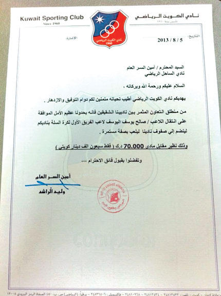 يذكر أن محاولات إدارة نادي القادسية المتكررة لضم اللاعبين كانت تواجه بالرفض من قبل الإدارة السابقة لنادي الساحل الا أن وجود الإدارة الجديدة التي تم انتخابها اكتوبر الماضي أنجح مساعيها هذا الصيف لاسيما بعد التدخل الشخصي في الصفقة من قبل رئيس الاتحاد الكويتي لكرة القدم الشيخ طلال الفهد الذي يعتبر الداعم الرئيسي للقائمة في الانتخابات الماضية."الجريدة" بدورها اتصلت بيوسف اليوسف والد اللاعب صالح ومدير لعبة كرة السلة بنادي الساحل سابقا، الذي أكد أنه وابنه لا يعرفان أي تفاصيل عن الصفقة من الناديين طوال الفترة الماضية، لكنه تلقى اتصالا من نادي القادسية يفيد بأن اللاعب مدعو لنادي القادسية بعد اجازة عيد الفطر لمناقشة تفاصيل الصفقة ماليا.ويعتبر صالح اليوسف وشايع مهنا من ابرز لاعبي كرة السلة على الساحة المحلية، إذ يتمتع الأول بطول فارع ومستوى مميز ويلعب بمركز الارتكاز، بينما يشغل الثاني مركز صانع الألعاب، ويمتاز بالعديد من المهارات وسبق له الاحتراف خليجياً.الكويت دخل على الخط مجدداً وكان نادي الكويت دخل على خط المفاوضات مع نادي الساحل، بعدما أرسل كتاباً رسمياً إليه يطلب فيه ضم صالح اليوسف مقابل 70 الف دينار بدءا من الموسم المقبل، لكن يبدو أن مجلس إدارة النادي لن يقوم حتى بمناقشة الكتاب، لموافقته المسبقة على انتقال اللاعبين الى نادي القادسية، وذكر مصدر لـ"الجريدة" أن كتاب الكويت وصل الى الساحل بعد اتخاذ مجلس الإدارة قرار الموافقة على انتقال اللاعبين الى القادسية.«زعزعة» في الساحلوتؤكد المصادر أن الوضع في صفوف فريق الساحل لن يستقر بعد سماح الإدارة للاعبين من العيار الثقيل كاليوسف ومهنا بالانتقال الى نادي القادسية، إذ توافد معظم اللاعبين الى إدارة النادي لطلب السماح بانتقالهم أيضاً أسوة بشايع وصالح، لاسيما ان الفريق الذي حصل على لقب كأس الاتحاد الموسم قبل الماضي، والمنافس بقوة على البطولات تعرض "للزعزعة"، وسيكون ضعيفا جداً لافتقاده اثنين من أهم ركائزه.