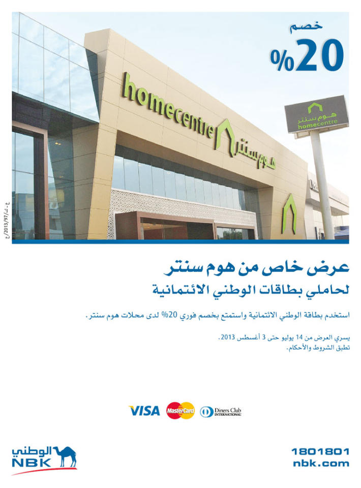 ويضاف هذا العرض الحصري الى سلسلة العروض المميزة التي يسعى البنك الوطني دائما الى تقديمها لعملائه، وذلك في اطار استراتيجيته الهادفة الى تقديم أفضل العروض وأكثرها ابتكاراً. ويعزز البنك الوطني صدارته وموقعه المتميز محلياً من خلال تطويره الدائم للخدمات المصرفية وتمتعه بأكبر شبكة فروع وقنوات توزيع في السوق المصرفي. وتتمتع بطاقات الوطني الائتمانية بتغطية واسعة على النطاق العالمي وتعتبر الوسيلة الأكثر سهولة لسداد قيمة المشتريات في الوقت الذي تتيح فيه لحامليها الاستفادة من العديد من المزايا والخصومات والمكافآت المميزة منها الدخول مجاناً إلى قاعات الانتظار في المطارات الدولية، اضافة الى خدمة كونسيرج للمساعدة الشخصية لتجهيزات السفر وغيرها من المزايا. تجدر الإشارة إلى أن «هوم سنتر» يعتبر الوجهة الأولى لمحبي التسوق في أجواء استثنائية من التميز، تتكامل مع الخدمات الشاملة لاقتناء أفضل المستلزمات المنزلية. وتتوفر في متاجر العلامة التجارية تشكيلة واسعة من الأثاث والمفروشات والإكسسوارات المنزلية، بالإضافة إلى باقة متنوعة من أدوات المطبخ والأسرّة والهدايا المبتكرة، التي تناسب جميع الأذواق.