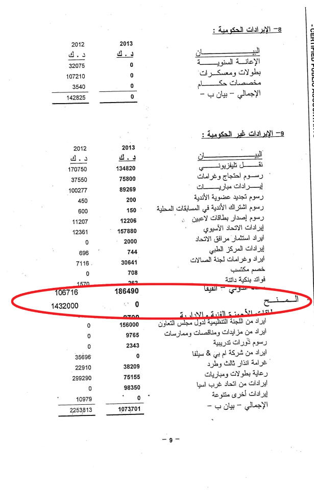 كشف التقرير المالي والإداري لاتحاد كرة القدم عن السنة المالية 2012-2013، والذي اعتمدته الجمعية العمومية للاتحاد في اجتماعها العادي مساء أمس الأول الأحد، بأغلبية 12 نادياً مقابل رفض ناديين اثنين فقط هما الكويت والفحيحيل، النقاب عن العديد من المفاجآت الصارخة، التي وضعت بدورها عدداً من علامات الاستفهام، وطرحت عدداً آخر من الأسئلة، وفي مقدمة هذه المفاجآت تلك الخاصة بمنحة سمو الأمير الشيخ صباح الأحمد البالغة مليوني دينار، والتي تم صرفها بموجب شيك من سموه للاتحاد صادر باسم رئيس مجلس إدارة الاتحاد الشيخ طلال الفهد، والذي أعلن عنه يوم 31 يوليو عام 2011 في مؤتمر صحافي عقده في مقر الاتحاد.