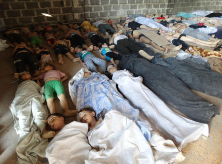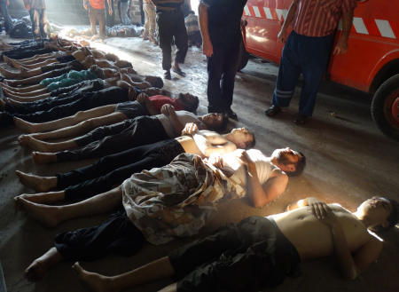 تحديث 1:: قالت المعارضة السورية إن قوات النظام السوري ارتكبت مجزرة فجر اليوم استخدم فيها السلاح الكيمياوي وراح ضحيتها مئات القتلى وآلاف المصابين المدنيين جلهم من الأطفال والنساء في الغوطة الشرقية بريف دمشق.ودعا رئيس الائتلاف الوطني السوري، أحمد الجربا، المجتمع الدولي الى تحمل مسؤوليته تجاه وقوع المجزرة، وطالب فريق الأمم المتحدة المتواجد في دمشق بهدف التفتيش عن الأسلحة الكيماوية، بالتوجه إلى مكان المجزرة.