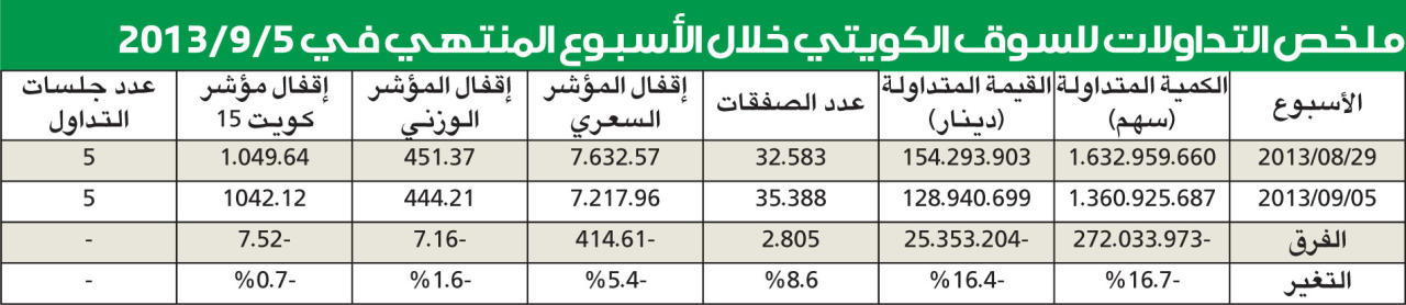 استقرت مؤشرات الاسواق الخليجية خلال الاسبوع الماضي في اول جلستين فقط، واستطاع بعضها استعادة جزء من خسائر الاسبوع الاسبق، ثم انزلقت بعد ذلك خلال آخر ثلاث جلسات بخسائر كبيرة بلغت في بعضها 3 في المئة اثناء الجلسة الواحدة.وكان خبر اطلاق صاروخين بالستيين شرارة السقوط لاسواق الاسهم الخليجية الثاني خلال اسبوعين فقط لتصل خسائر بعضها الى 7.4 في المئة كمحصلة اسبوعية في سوق دبي الذي تراجع نحو 186 نقطة متكبدا اكبر خسارة اسبوعية خليجية خلال هذا العام متراجعا الى مستوى 2337.17 نقطة، تلاه مؤشر سوق ابوظبي القريب منه والذي خسر خلال الاسبوع 5.4 في المئة مسجلا خسارة قدرها 197 نقطة ليقفل عند مستوى 3537.61 نقطة، ثم المؤشر السعري لسوق الكويت بنسبة مساوية لمؤشر ابوظبي وبخسائر بالنقاط وصلت الى 414.61 نقطة ليقفل عند مستوى 7217.96 نقطة، وكانت خسائر سوقي مسقط والدوحة اقل بقليل نسبيا من الاخرى حيث تراجع مؤشر سوق قطر بنسبة 4.3 في المئة بعد أن اطاح 414.12 نقطة ليقفل عند مستوى 9205 نقطة تقريبا وكانت خسارة سوق مسقط قريبة بـ4.2 في المئة ليقفل عند مستوى 6413.34 نقطة بعد أن انخفض 278.27 نقطة كمحصلة اسبوعه الاخير.السعودي يخسر 1.7% سجل مؤشر السوق السعودي اقل خسارة بين الاسواق النشطة خليجيا، اذ وصلت الى 1.7 في المئة فقط بعد أن حذف 132.22 نقطة ليقفل عند مستوى 7634.3 نقطة ورغم مراقبة الاسواق بعضها لبعض فان تأثير سوق دبي كان الاكبر على بقية الاسواق حيث يتداول هناك مستثمرون اجانب قد يكونون اكثر تأثيرا بما يحدث ويبالغون في الاتجاه للبيع خصوصا وان سوق دبي من افضل اسواق العالم اداء هذا العالم، وبعكس اسواق خليجية اخرى كالسعودي الذي لم ينطلق للمكاسب الكبيرة سوى خلال الشهرين الماضيين.ورغم شح سيولته ومحدودية نشاطه تراجع مؤشر سوق المنامة بنسبة محدودة بلغت 0.6 في المئة ليقفل عند مستوى 1180.77 نقطة.تباين مؤشرات سوق الكويترغم تراجع جميع مؤشرات سوق الكويت للاوراق المالية الثلاث فانها كانت بنسب متباعدة حيث تعمقت في "السعري" الذي خسر 5.4 في المئة كما ذكرنا انفا بينما لم تزد خسائر مؤشر كويت 15 عن 0.7 في المئة متراجعا بـ7.5 نقاط ليقفل عند مستوى 1042.12 نقطة بينما خسر الوزني 1.6 في المئة متراجعا 7.16 نقطة ليقفل عند مستوى 444.21 نقطة والمؤشران يقيسان اداء الشركات القيادية وهي الشركات التى لم تحقق مكاسب كالصغيرة خلال فترة النصف الاول من هذا العام وبالتالى كان تراجعها محدودا خصوصا وانها مكونات محافظ وصناديق مؤسساتية بالغالب وليست مضاربية ومن اهمها المحفظة الوطنية التى تأسست نهاية عام 2008 بهدف حفظ السوق من انزلاق خطير خصوصا بالنسبة الى اسهم قيادية وهو ما لم يحصل حتى الآن حيث كانت الانهيارات تشمل الاسهم الصغرى والمضاربية والتي اشار اليها تراجعات المؤشر السعري بوضوح.إدراج وربةكان من اهم احداث الاسبوع الماضي في السوق الكويتي ادراج سهم بنك وربة وهو الاكتتاب الاكبر على مستوى الكويتي والذي اكتتبت الحكومة لمواطنيها بهذا البنك الاسلامي وهي فكرة حديثة لا شك قطف ثمارها المواطن بعد ثلاث سنوات خلال الاسبوع الماضي ويمكن ان تزيد ارباحه خلال الاسبوع الحالى بعد طلبات كبيرة بالحد الاعلى على السهم دون وجود كميات بيع تماثلها لدى الملاك الكثر عدا طبعا هيئة الاستثمار التي تتملك 24 في المئة من اسهم التأسيس، ولهذه الاسباب لم نجد تأثيرا كبيرا في القيمة والسيولة حتى الآن على نشاط السوق وسيولته عدا ارتفاع عدد الصفقات بسبب تفرق الاسهم وملكياتها الصغيرة والتى تباع منذ بدء الجلسة وحتى نهايتها لترفع عدد صفقات السوق بنسبة 8.6 في المئة قياسا بالاسبوع الاسبق وعلى عكس السيولة المتراجعة بنسبة 16.4 في المئة والنشاط بنسبة قريبة من السيولة.