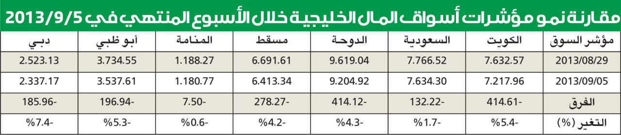 استمر تراجع أسواق المال الخليجية للأسبوع الثاني على التوالي، متأثرة بالأجواء المشحونة في المنطقة على خلفية احتمال توجيه ضربة عسكرية أميركية للنظام السوري، فضلاً عن إطلاق صاروخين بالستيين في البحر المتوسط.