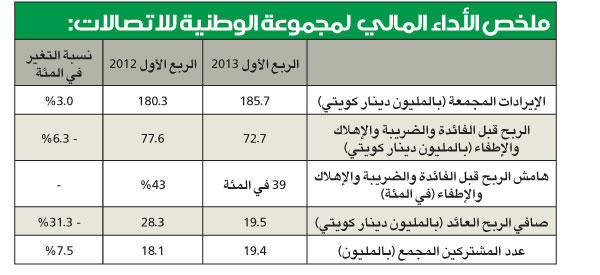 أعلنت الشركة الوطنية للاتصالات ارباحها للربع الاول من العام الجاري حيث بلغت 19.5 مليون دينار في حين حققت الشركة ايرادات تجاوزت 185 مليون دينار كويتي.وارتفع اجمالي عدد العملاء النشطين في نهاية الربع الاول 2013 إلى 419 مليون عميل، مقارنة بـ18.1مليون عميل في الفترة ذاتها من سنة 2012، مشيرا الي زيادة بلغت 7.8 في المئة. وبلغت الإيرادات في نهاية الربع الاول 2013 نحو 185.7 مليون دينار (650.7 مليون دولار) مقارنة بـ 180.3مليون دينار (631.8مليون دولار) في الفترة ذاتها من سنة 2012 أي بزيادة بلغت 3.0 في المئة.وبلغ الربح قبل الفائدة والضريبة والإهلاك والإطفاء في الربع الاول 201372.7 مليون دينار (254.8مليون دولار أميركي)، مقارنة بـ 77.6مليون دينار (271.9مليون دولار أميركي) في الفترة ذاتها من سنة 2012.واستقر صافي الربح المجمع في نهاية الربع الاول 2013 عند 22.6 مليون دينار (79.1 مليون دولار), مقارنة بـ 32.6 مليون دينار (114.2 مليون دولار) في الفترة ذاتها في سنة 2012, يتضمن صافي الربح المجمع للربع الاول 2013 مطالبات ضريبية إضافية من تونس والمتعلقة بالسنوات الخمس السابقة، التي وردت رسميا بعد الانتهاء من التقارير المالية لعام 2012 للوطنيه للاتصالات. ووصل صافي أرباح الوطنية للاتصالات في الربع الاول 2013 الى 19.5 مليون دينار كويتي (68.2 مليون دولار أميركي) مقارنة مع صافي أرباح 28.3 مليون دينار كويتي (99.2 مليون دولار) لنفس الفترة من عام 2012. وعلاوة على ذلك يعزى الانخفاض في أرباح المجموعة إلى التنافسية في السوق الكويتي، كما تأثرت العمليات في تونس من الوضع الاقتصادي الذي لايزال صعبا والمطالبات الضريبية لمدة السنوات الخمس الماضية، وكذلك تأثير سعر صرف العملات الأجنبية في الجزائر.ووصلت ربحية السهم المجمعة الى 39 فلسا (14سنتا) مقارنة بـ56 فلسا (20 سنتا) للسهم في الفترة ذاتها من سنة 2012.وبهذه المناسبة قال الشيخ عبدالله بن محمد بن سعود آل ثاني، رئيس مجلس إدارة الوطنية للاتصالات:«لقد بدأنا 2013 مع استمرار النمو الإيجابي في الأسواق الدولية على الرغم من التحديات التنافسية والاقتصادية الجارية محليا وفي الأسواق الرئيسية، وشهدت الشركة الوطنية للاتصالات نمو الإيرادات بنسبة 3.0 في المئة مقارنة مع نفس الفترة في عام 2012 “، وأضاف: “حافظت الجزائر على قيادتها القوية لنمو المجموعة، وأثبتت تونيزيانا قدرتها على الاداء بشكل جيد في بيئة صعبة، في حين أن التحديات لاتزال موجوده في سوق الكويت . « الأداء التشغيلي للمجموعةيمكن تلخيص الاداء التشغيلي لمجموعة الوطنية للاتصالات كما يلي:«الوطنية”الكويت: ارتفع عدد عملاء الوطنية للاتصالات في نهاية الربع الاول 2013 إلى 1.98 مليون عميل بزيادة بلغت 2.6 في المئة عن الفترة ذاتها في سنة 2012, كما بلغت ايرادات الربع الاول في 2013 بـ52.7 مليون دينار (184.6مليون دولار)، مقارنة بإيرادات بلغت 57.9 مليون دينار (202.7 مليون دولار) في الفترة ذاتها من سنة 2012 اي بانخفاض 9 في المئة، بلغ الربح قبل الفائدة والضريبة والإهلاك والإطفاء في نهاية الربع الاول 2013 من السنة الحالية 16.9 مليون دينار (59.1 مليون دولار)، مقارنة بـ 24.5مليون دينار (85.9 مليون دولار) في الفترة ذاتها من سنة 2012 أي بانخفاض بلغ 31.1 في المئة. وفي نهاية الربع الاول 2013 بلغ صافي الربح 9.5 ملايين دينار (33.2 مليون دولار)، مقارنة بـ15.5 مليون (54.4 مليون دولار) في الفترة ذاتها من سنة2012.«تونيسيانا” تونس: استقر عدد عملاء تونسيانا في نهاية الربع الاول 2013 عند 7.25 ملايين عميل. بزيادة بلغت 6.3 في المئة عن الفترة ذاتها في سنة 2012، أما إلايرادات في نهاية الربع الاول 2013 بلغت 47.6 مليون دينار (166.8 مليون دولار) مقارنة بإيرادات بلغت49.1 مليون دينار (172.2 مليون دولار) في نهاية الربع الاول 2012. لقد بلغ الربح قبل الفائدة والضريبة والإهلاك والإطفاء24.0مليون دينار (84.2 مليون دولار) مقارنة بـ28.9 مليون دينار (101.2 مليون دولار) أي بانخفاض بلغ 16.9 في المئة عن الفترة ذاتها في سنة 2012 استقر صافي الربح في نهاية الربع الاول 2013 الى 5.1 ملايين دينار (17.7 مليون دولار) مقارنة بـ14.0مليو