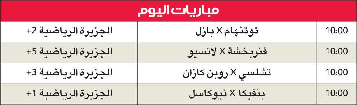 يسعى تشلسي الإنكليزي وجاره اللندني توتنهام الى قطع نصف الطريق نحو الدور نصف النهائي عندما يستضيفان روبن كازان الروسي وبازل السويسري على التوالي اليوم الخميس في ذهاب الدور ربع النهائي من مسابقة الدوري الاوروبي "يوروبا ليغ" لكرة القدم.ويحل الممثل الثالث للانكليز نيوكاسل ضيفا على بنفيكا البرتغالي في مهمة صعبة، فيما يلتقي فنربخشة التركي مع ضيفه لاتسيو الايطالي في قمة لا تخلو من صعوبة واهمية.