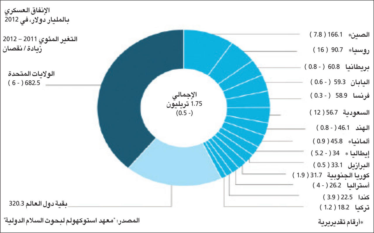 هبط الإنفاق العسكري العالمي بنسبة 0.5 في المئة خلال السنة الماضية ليصل إلى 1.75 تريليون دولار، وهو أول هبوط سنوي منذ عام 1998، وذلك وفقاً لمعلومات جديدة صدرت عن "معهد استوكهولم لبحوث السلام الدولية"، وما زالت الولايات المتحدة تتربع عرش الإنفاق العسكري عالميا بزيادة 69% عن نفقاتها الفعلية في عام 2001. ورغم ذلك هبطت النفقات العسكرية الأميركية في هذا العام إلى ما دون 40 في المئة من النفقات العسكرية الإجمالية العالمية، وهي المرة الأولى منذ عام 1991، وفي حقيقة الأمر، فإن الإنفاق العسكري عالمياً مني بهبوط نسبته 10% في 20 دولة من أصل 37 دولة في غرب ووسط أوروبا منذ فترة الركود في سنة 2008.وفي المقابل زادت روسيا إنفاقها العسكري بـ16 في المئة خلال عام 2012 وتخطط لمزيد من الزيادة في سنة 2015، وأنفقت كل من روسيا والولايات المتحدة مايعادل 4.4 في المئة من الناتج المحلي الإجمالي، وهو أعلى بكثير من المعدل الدولي البالغ 2.5 في المئة، غير أنه أقل من معدلات المملكة العربية السعودية التي بلغت 8.9 في المئة.أما بالنسبة إلى الصين فقد قفزت ميزانيتها العسكرية خلال العقد الماضي بنسبة 175 في المئة، وهي أعلى زيادة في أي من الدول الواردة في الرسم البياني على الرغم من أن نفقاتها لا تزال تمثل حوالي 2 في المئة فقط من الناتج المحلي الإجمالي.