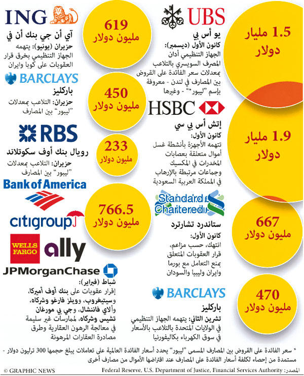 وشدد على أن أنصاف الحلول لن تكون كافية. وما لم يتم تطويق الديون السيادية المستحقة على بقية بلدان منطقة اليورو تباعا، فإن عجز اليونان عن سداد ديونها قد يؤدي إلى انهيار النظام المالي العالمي. وحتى لو لم يقع مثل هذا السيناريو المأساوي في عام 2012، فقد زرعت القمة بذور النزاعات في المستقبل ــــ حول ظهور أوروبا «ذات السرعتين»، وحول المبدأ الاقتصادي الزائف الذي تسترشد به المعاهدة المالية المقترحة لمنطقة اليورو.وعلى الرغم من سقوط احتمال خروج اليونان من التكتل الأوروبي، وعدم وقوع السيناريو المأساوي «انهيار النظام المالي العالمي» خلال العام الذي يلفظ أنفاسه الأخيرة، إلا أنه مما لاشك فيه أنه (عام 2012) استحق، بجدارة لقب «عام الحيرة»، كما أن تلك البذور، التي تحدث عنها سوروس في مقاله، نبتت وترعرعت ودخل العالم كله في نزاعات وأزمات اقتصادية متواصلة. سنة الفضائحدخلت 2012 التاريخ على أنها سنة الفضائح المصرفية، إذ تدفع المصارف أكثر من 6 مليارات دولار للأجهزة التنظيمية في بريطانيا والولايات المتحدة الأميركية بشأن مزاعم في قضايا احتيال وغسل أموال وتلاعب في معدلات أسعار الفائدة.