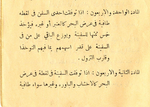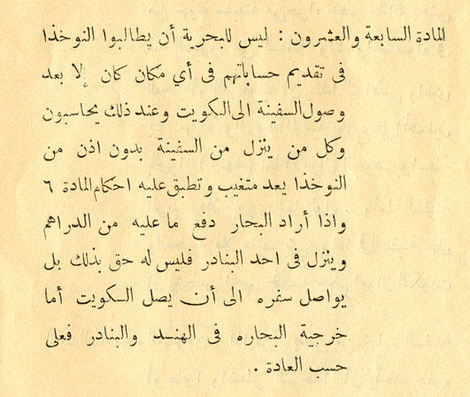 من ذلك يتضح أن البحرية شركاء في صافي الربح ويكون لهم نصفه، ولكن حسب المادة السابعة والعشرين والمادة السادسة والثلاثين فإن الأموال لا توزع على البحارة إلا بعد العودة إلى الكويت ويكون توزيعها بحسب حصصهم المتفق عليها قبل بدء الرحلة. ومن حقوق البحرية أن يتشاركوا مع صاحب السفينة في حالة العثور على مواد قيمة في عرض البحر كالعنبر، حيث نصت المادة الحادية والأربعين على أن خمس قيمة ما يعثر عليه يكون للسفينة والباقي يوزع على من في السفينة، بمن فيهم النوخذة. أما ما يتعلق بحقوق البحار في العلاج اذا احتاج اليه، فقد تحدثنا عن ذلك في المقال السابق وأوضحنا انه من الواجبات المفروضة على النوخذة وشرحنا تفاصيل ذلك. وكما أن للبحار حقوقاً، فانه مطالب بواجبات كثيرة، منها الطاعة الكاملة للنوخذة، والاستئذان عند الرغبة في النزول من السفينة، والقيام بمسؤوليته على أحسن وجه، والمحافظة على سلامة السفينة، والالتزام بمواد القانون، والالتزام بالأخلاق الطيبة والمعاملة الحسنة. وعلى سبيل المثال، تنص المادة الخامسة على أنه ليس من حق المجدمي او البحارة معارضة النوخذة وصاحب السفينة في التوجه الى أي ميناء أثناء الرحلة. كما تنص المادة السادسة على أنه يجب على المجدمي ألا يغادر السفينة إلا بعد الحصول على إذن من النوخذة وإلا اعتبر ذلك مخالفة تستحق العقاب. أما المادة الثالثة والأربعون فانها تعطي الحق للنوخذة باتخاذ إجراءات مشددة إذا اعتدى أحد البحرية على آخر، وتطالب البحرية بالوقوف مع النوخذة في موقفه مهما كان هذا الموقف. ومن حق النوخذة أيضا، حسب هذه المادة، ان يطرد البحار من السفينة اذا كان وجوده فيها يشكل خطرا على سلامة العاملين او سلامة السفينة. وهناك الكثير من الحالات التي ناقشها القانون في مواده التي زادت على الستين وفيها شرح واف لكيفية التعامل مع هذه الحالات، إضافة الى تفصيلات عديدة للمسائل المالية وحقوق كل طرف فيها. أكتفي بهذا القدر في حديثي عن قانون السفر الشراعي الجميل، وأتمنى ان أكون قد قدمت معلومات مفيدة حول الشراكة التجارية بين صاحب السفينة والنوخذة والبحرية في مهنة السفر الشراعي التاريخية.