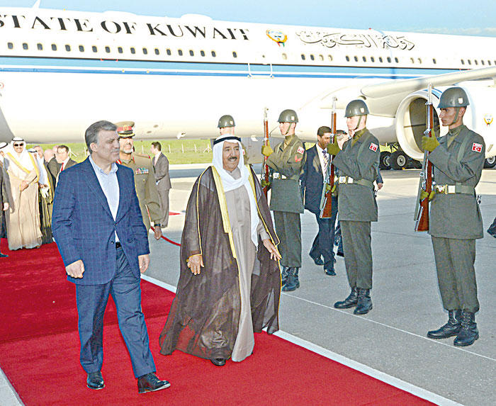 وصل سمو أمير البلاد الشيخ صباح الأحمد والوفد الرسمي المرافق لسموه عصر أمس إلى مطار ايزنبوجا الدولي في العاصمة التركية أنقرة، وذلك في زيارة رسمية إلى جمهورية تركيا.وكان في استقبال سموه على أرض المطار رئيس جمهورية تركيا عبدالله غول، ورئيس بعثة الشرف المرافقة وزير الجمارك والتجارة حياتي يازجي، وحاكم أنقرة علاء الدين يوكسار، وقائد قوات أنقرة عصام أديار، وعمدة أنقرة سيلي جولجك، وسفير دولة الكويت لدى تركيا عبدالله الذويخ، وقنصل عام دولة الكويت في مدينة إسطنبول الشيخ فهد السالم، وأعضاء السفارة.