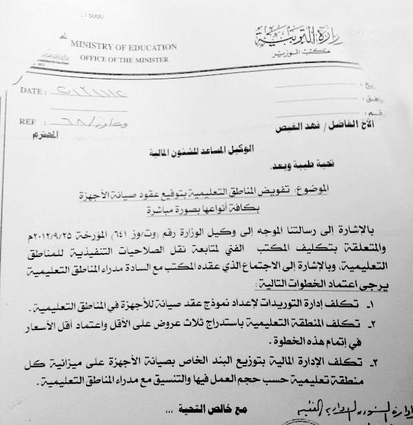 وقال الحجرف في كتاب وجهه إلى الوكيل المساعد للقطاع المالي فهد الغيص، وحصلت "الجريدة" على نسخة منه، إنه "بالاشارة إلى رسالتنا الموجهة إلى وكيل الوزارة بتاريخ 25 سبتمبر 2012 المتعلقة بتكليف المكتب الفني لمتابعة نقل الصلاحيات التنفيذية للمناطق التعليمية، وبالاشارة إلى الاجتماع الذي عقده المكتب مع السادة مديري عموم المناطق التعليمية، فإنه تقرر تكليف ادارة التوريدات لاعداد نموذج عقد صيانة للأجهزة في المناطق التعليمية، وتكليف ادارات المناطق باستدراج ثلاثة عروض على الأقل، واعتماد أقل الأسعار في إتمام هذه الخطوة". وأشار إلى أنه "تم تكليف الادارة المالية بتوزيع البند الخاص بصيانة الاجهزة على ميزانية كل منطقة تعليمية حسب حجم العمل فيها والتنسيق مع مديري العموم بهذا الشأن". تمديد العقوديذكر أن المناطق التعليمية كانت تعاني من مسألة التأخير في توقيع عقود الصيانة، والتي تسببت في تعطيل العمل في أكثر من منطقة تعليمية، ومنها منطقة حولي التعليمية التي انتهت عقود الصيانة فيها دون أن يتم توفير عقود جديدة، مما تسبب في تكدس طلبات الصيانة المقدمة من المدارس، وذلك لطول الدورة المستندية، وبالرغم من أن الميزانية المخصصة لعقود الصيانة متوافرة لدى التربية فإنها اضطرت إلى طلب تمديد عقود الصيانة القديمة الى حين إرساء المناقصات الجديدة.وكانت فكرة نقل الصلاحيات وتفويض المناطق التعليمية تنفيذ بعض الاختصاصات طرحت ابان تولي الوزيرة السابقة نورية الصبيح، التي كانت متحمسة لهذه الفكرة، وتحدثت كثيرا عنها في تصريحاتها الصحافية مؤكدة أهميتها لتسريع وتيرة العمل والقضاء على الروتين والبيروقراطية الادارية، لكن انشغالها في الاحداث التي عصفت بالوزارة في تلك الفترة وخروجها بعد ذلك تسبب في تعطيل إنجاز الفكرة حتى قدوم الوزير الحجرف، الذي تابع تنفيذها من خلال تشكيله للجنة برئاسة عبدالعزيز الجارالله رئيس مسشاري المكتب الفني التابع لمكتب الوزير، الأمر الذي بدأت "التربية" تجني ثماره حالياً.