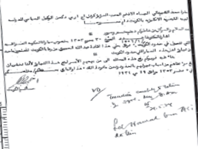 في الأسبوع الماضي تحدثنا عن حادثة ناصر بن فهاد القحطاني ومرشد البريهي اللذين تعرضا لإطلاق النار من قبل دورية عراقية في بر الكويت عام 1934، وعرضنا وثيقتين بتوقيع الشيخ أحمد الجابر، يطلب فيهما من المعتمد البريطاني في الكويت العمل على إعادة المنهوبات، والقصاص من قتلة ناصر بن فهاد.واليوم نعرض لكم وثيقة أخرى مشابهة، وهي أيضاً بتوقيع الشيخ أحمد الجابر، ويعود تاريخها إلى عام 1934. مضمون الوثيقة أن الشيخ أحمد أراد أن يفيد المعتمد البريطاني بوجود سيارات عراقية مسلحة تخترق الحدود الكويتية، وترعب عرب الكويت من البدو القاطنين بالقرب من الحدود، كما أفاد المعتمد البريطاني بأنه أرسل سيارة كويتية فيها عدد من الرجال بقيادة مرشد (ربما يكون مرشد بن طوالة)، لكي يتحققوا من وجود السيارة العراقية، وعادوا بعد ذلك وهم متأكدون من وجود هذه السيارات في الأراضي الكويتية. وبناء على ذلك طلب الشيخ أحمد الجابر من المعتمد البريطاني العمل على وقف هذه الاختراقات الحدودية بين البلدين، لتجنب وقوع حوادث تضر بالعلاقات الطيبة بين الطرفين. وإليكم نص الرسالة وتفاصيلها: