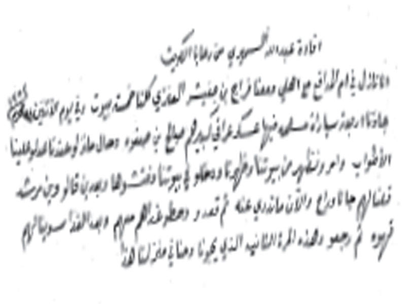 "حضرة حميد الشيم عالي الجاه الأفخم المحب العزيز كرنل اج اربي دكسن الوكيل السياسي للدولة البهية القيصرية الانكليزية بالكويت دام محروسا،،،بعد السلام والسؤال عن خاطركم دمتم بخير وسرور،،، قد سمعنا ان يوجد سيارات للحكومة العراقية مسلحة تتجول في داخل حدود الكويت وتتعرض للعشائر القاطنين من رعايا الكويت. فلهذا اوجب أن نرسل سيارة منطرفنا (من طرفنا) لأجل الكشف على ذلك. وفعلا عمدنا سيارة فيها خدام كبيرهم مرشد أمرناهم يمشون في حدود الكويت ويجرون التحقيقات اللازمة، وقد وصلوا حول الروضة، وانقلبوا على ام المدافع، ووجدوا هناك بعض من عرب الكويت سئلوهم عن السيارات وأفادوهم أنها تدور عليهم يومية. ويقول ولد راضي السميري من عرب الكويت نازل في أم المدافع ان السيارات جاءتنا يوم الجمعة في 27 الجاري موافق 11 مي (مايو) 1934م وفتشوا بيوتنا، ولما اعترضنا على خطأهم في تفتيش البيوت ضربوا واحد منا في عصا. وخبر العرب الذين نازلين باللياح والديرعات يذكرون ان السيارات ما تقاطعهم يومية تجيهم وتروح إلى جهة الجنوب. بناء عليه قد تحقق تجول السيارات في حدود الكويت ومعارضتهم لعشائرنا وهذا أمر ما نرضاه حيث أننا ما نود أن يقع بيننا وبين جيراننا ادنا شيء يكدر صفو الوداد ويخل في حقوق الجوار. وقد أمرت خادمنا مرشد يحضر لدى سعادتكم ويفيدكم بالتحقيقات التي وقف عليها. ونرجوكم أن تعرضون الكيفية على المراكز الايجابية لمنع تجول السيارات بالحدود خشية من أن يقع سوء تفاهم مخلا لحقوق الجوار. هذا والباري يحفظكم.في 30 محرم 1353هـ موافق 14 مي 1934م. مخلصكم حاكم الكويت احمد الجابر"وبعدها بعدة أيام أرسل الشيخ أحمد الجابر رسالة ثانية تتضمن إفادة خطية من عبدالله السميري يوثق فيها ما تعرض له وعائلته من تعد وتجاوز من قبل السيارات العسكرية العراقية، وإليكم نص الإفادة:"إفادة عبدالله السميري من رعايا الكويتأنا نازل في ام المدافع مع أهلي ومعنا فراج جغيشر العنزي كلنا خمسة بيوت، وفي يوم الاثنين 30 محرم 1353هـ جاءنا أربعة سيارات مسلحة فيها عسكر عراقي كبيرهم صالح بن صفوة، وحال ما نزلوا عندنا عدلوا علينا الاطواب، وأمروا نظهر من بيوتنا، ودخلوا في بيوتنا وفتشوها، وبعدين قالوا وين مرشد، قلنا لهم جانا وراح والان ما ندري عنه، ثم قعدوا وحطوا غداهم معهم، وبعد الغدا سوينا لهم قهوة ثم ارجعوا. وهذه المرة الثانية الذي يجونا وحنا في منزلنا هذا".وللفائدة، فإن عبدالله السميري هو خال المرحوم حمد بن راشد بورسلي، الذي من أبنائه العم سليمان (بومنصور) والزميل رسلي (بوحمد). في الأسبوع المقبل سنعرض لكم إن شاء الله قصة أخرى وقعت في نوفمبر من عام 1934 في جزيرة وربة للنوخذة جاسم بن خليل وسنشرح لكم تفاصيلها.