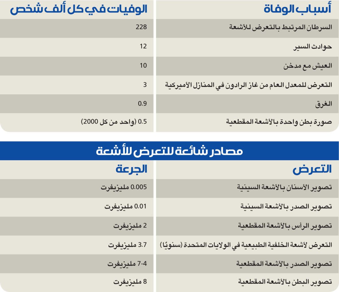 رغم ذلك، يجب ألا تخضع للتصوير بالأشعة المقطعية إلا إذا كان ذلك ضروريًّا. وقد تتوافر لك أحياناً بدائل أخرى لا تعرضك للأشعة.يرتكز فهمنا لمخاطر التعرض للأشعة على دراسة تناولت الناجين من القنبلتين الذريتين في اليابان. يحتسب العلماء مخاطر الإصابة بالسرطان بناء على معدل الأشعة التي تعرض لها الناجون وعدد مَن أصيب منهم لاحقًا بالسرطان.تُقاس جرعة الأشعة خلال كل عملية تصوير بالأشعة المقطعية بالمليزيفرت (mSv). نتعرض جميعنا لمقدار ضئيل من الأشعة الطبيعية من الشمس، الأرض، وحتى بعض المواد الكيماوية الطبيعية في جسمنا. يبلغ متوسط أشعة الخلفية الطبيعية في الولايات المتحدة 3.7 مليزيفرت/سنويًّا. أما الخضوع لتصوير عادي للصدر بالأشعة السينية (من الأمام والخلف) فيعرض الإنسان لنحو 0.01 مليزيفرت، أي ما يعادل تقريبًا الكمية التي تتعرض لها طبيعيّاً.لكن جرعات التصوير بالأشعة المقطعية أعلى بكثير. فالخضوع لتصوير للصدر بالأشعة المقطعية يُعرضك لنحو 7 مليزيفرت. إلا أن الدكتور ساهاني يشير إلى أن الاستخدام الذكي لآلات التصوير الحديثة يحدّ من الجرعة ويخفضها إلى ما يُقارب 4 مليزيفرت. وإذا خضعت لتصوير للصدر بالأشعة المقطعية منخفض الجرعة يدوم 15 ثانية فحسب يكون الهدف منه البحث عن أي ورم سرطاني غير مكتشف، يتدنى معدل الأشعة إلى ما لا يزيد عن 1.5 مليزيفرت.متى تزيد الأمور عن حدها؟ كلما خضعت لتصوير بالأشعة المقطعية، ارتفع معدل تعرضك للأشعة وازدادت معه المخاطر. تنصح الكلية الأميركية لعلم الأشعة بالحد من التعرض للأشعة الناجمة عن عمليات التصوير طوال الحياة بنحو 100 مليزيفرت. ويعادل هذا الخضوع لعشرة آلاف تصوير للصدر بالأشعة السينية أو ما يُقارب 25 عملية تصوير للصدر بالأشعة المقطعية.خلال التداوي من عدد من الأمراض المزمنة، خصوصاً السرطان، قد تتراكم كمية الأشعة التي تتعرض لها من التصوير بالأشعة المقطعية لتقارب حدّ المئة مليزيفرت. يعود ذلك إلى أن المريض قد يحتاج إلى صور عدة لمتابعة حالته وتحديد مدى فاعلية العلاج وما إذا كان السرطان قد عاود الظهور. في هذه الحالة، تفوق مخاطر السرطان الذي يعانيه المرض أي مخاطر قد يشكلها التصوير بالأشعة المقطعية.ما هي المخاطر؟تشمل مناطق الجسم التي تُعتبر الأكثر عرضة للإصابة بالسرطان نتيجة التصوير بالأشعة المقطعية الصدر، البطن، والحوض، حيث تكون الخلايا التي تنمو بسرعة أكبر أكثر تأثرًا بالأشعة. يبلغ خطر الخضوع لمرة لتصوير البطن بالأشعة المقطعية، التي تبلغ في هذه الحالة 8 مليزيفرت، 0.05%، أي ثمة احتمال من بين ألفين أن تُصاب بالسرطان. الآن، لنتأمل في خطر الموت نتيجة الإصابة بالسرطان، بغض النظر عن سببه. يساوي هذا الخطر واحداً من كل أربعة ويزداد مع التقدّم في السن. إذاً، لا يشكّل خطر الخضوع لتصوير بالأشعة المقطعية إلا إضافة بسيطة إلى معدل الخطر إن كنت مسناً.يعود ذلك إلى أن الأشعة تحتاج إلى عقود لتتطور إلى سرطان إن خضعت للتصوير بالأشعة المقطعية وأنت في منتصف العمر أو لاحقاً في الحياة. في المقابل، ما زال أمام الطفل أو الشاب سنوات طويلة قد يتحوّل خلالها التعرض المتكرر للأشعة المقطعية إلى سرطان.صحيح أن فوائد التصوير بالأشعة المقطعية في حالة الرجال البالغين، خصوصًا مَن تخطوا الخمسين، تفوق مخاطره، لكن يجب ألا يخضع أي رجل، حتى لو بلغ السبعين أو الثمانين من العمر، لتصوير بالأشعة المقطعية من دون سبب وجيه. يوضح الدكتور ساهاني: «علينا دومًا توخي الحذر عند استخدام الأشعة المؤينة. فإن لم يكن من داعٍ للتعرض لمزيد منها، فلمَ نكبّد المريض هذه المشقة؟». لا تخضع إلا لعمليات التصوير الضرورية واختر مراكز تصوير حديثة لا تُعرضك إلا للمقدار الأدنى المطلوب من الأشعة.