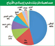وتصدر بنك الكويت الوطني باقي البنوك في حجم الارباح كالعادة محققاً 128.5 مليون دينار بنسبة 46 في المئة، تلاه بيت التمويل الكويتي بـ49.8 مليون دينار وبنسبة 18 في المئة، ثم بنك برقان بـ27.9 مليون دينار وبنسبة 10 في المئة، والبنك الاهلي المتحد بـ23.2 مليون دينار وبنسبة 8 في المئة والبنك الاهلي الكويتي بـ17.2 مليون دينار وبنسبة 6 في المئة وبنك الخليج بـ14.3 مليون دينار وبنسبة 5 في المئة، والبنك التجاري الكويتي بنسبة 3 في المئة وبقيمة 7.7 ملايين دينار، وبنك بوبيان بقيمة 6.3 ملايين دينار بنسبة 2 في المئة وأخيرا بنك الكويت الدولي بقيمة 6 ملايين دينار.
