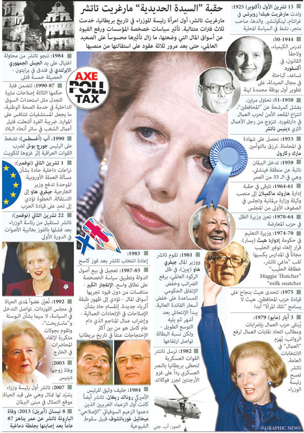 ومع إعلان نبأ الوفاة عادت ذاكرة الكويتيين إلى مواقف تاتشر إبان الغزو العراقي الغاشم للكويت قبل قرابة 23 عاماً، إذ دفعت العالم إلى اتخاذ موقف دولي حاسم تحت مظلة الأمم المتحدة لدحر المحتلين وتحرير البلاد في فبراير 1991.توفيت رئيسة الوزراء البريطانية السابقة مارغريت تاتشر، التي تعد من أبرز الشخصيات السياسية في القرن العشرين، أمس في لندن عن 87 عاماً إثر إصابتها بجلطة دماغية، مما دفع رئيس الحكومة الحالية ديفيد كاميرون إلى قطع جولة كان يقوم بها في أوروبا.وقال المتحدث باسم "المرأة الحديدية" اللورد تيم بيل، في بيان مقتضب، "ببالغ الحزن يعلن مارك وكارول تاتشر أن أمهما البارونة تاتشر توفيت بسلام هذا الصباح إثر جلطة دماغية".وقال ديفيد كاميرون، الذي كان موجوداً في إسبانيا عند إعلان نبأ وفاتها: "لقد فقدنا قائدة عظيمة ورئيسة وزراء عظيمة وبريطانية عظيمة"، معرباً عن "حزنه الكبير"، كما قرر اختصار جولته التي بدأها في أوروبا للدفاع عن خطته لإصلاح الاتحاد الأوروبي والعودة إلى لندن.ولن تكون هناك جنازة وطنية "للمرأة الحديدية"، كما أوضحت رئاسة الحكومة البريطانية، التي أكدت أن "جثمان الفقيدة سيحرق".وقال قصر باكنغهام الملكي، في بيان، إن الملكة إليزابيث الثانية "حزنت لدى تلقي هذا النبأ"، مبيناً أنها سترسل "برقية مواساة لأسرة تاتشر"، تشدد فيها على تعاطفها معها في هذه الأوقات الحزينة.ونكس العلم البريطاني فوق قصر باكنغهام ومقر الحكومة في 10 داونينغ ستريت، في حين وضعت الزهور أمام منزل تاتشر في حي تشلسي في غضون ساعة من إعلان وفاتها.صديقة واشنطنوعلى الفور توالت ردود الفعل المعزية، ففي واشنطن حيا الرئيس باراك أوباما ذكرى تاتشر ووصفها بـ"الصديقة الحقيقية" للولايات المتحدة. وقال في بيان "مع وفاة البارونة مارغريت تاتشر فقد العالم أحد كبار المدافعين عن الحرية وتفقد الولايات المتحدة صديقة حقيقية"، مشيدا بالتزام رئيسة الحكومة السابقة إزاء التحالف الأميركي- البريطاني.واعتبر وزير الخارجية الأميركي الأسبق هنري كيسنجر أن تاتشر "كانت شخصية شجاعة، سيدة أدركت أن الزعيم يجب أن يكون لديه قناعات راسخة لأن الناس ليس لديهم أي وسيلة ليقرروا بأنفسهم إلا إذا أعطاهم قادتهم التوجه الواجب اتباعه".وفي برلين، عبرت المستشارة الألمانية انجيلا ميركل عن "حزنها لوفاة تاتشر التي تركت بتوليها منصب رئيسة الوزراء سنوات طوالا، بصماتها على بريطانيا الحديثة، كانت قائدة عظيمة في حقبتنا".كذلك حيا الرئيس الفرنسي فرنسوا هولاند، في بيان، روح تاتشر، مشدداً على أن العلاقة التي كانت تقيمها مع فرنسا اتسمت "دوما بالصراحة والصدق". وقال: "طوال حياتها العامة ومع قناعاتها المحافظة التي كانت متمسكة بها كلياً، كانت حريصة على تألق المملكة المتحدة والدفاع عن مصالحها"، كما أشاد بـ"اندفاعها الحاسم" من أجل بناء النفق تحت المانش.إسهاماتها وتحفظاتهابدوره، اعتبر الاتحاد الأوروبي أن اسمها سيبقى في التاريخ لـ"إسهاماتها" وأيضاً لـ"تحفظاتها" إزاء المشروع الأوروبي. وقال رئيس المفوضية الأوروبية جوزيه مانويل باروزو إنها "كانت بدون ادنى شك سيدة دولة عظيمة، أول امرأة رئيسة للوزراء في بلادها، متحفظة لكن ملتزمة بالاتحاد الأوروبي".وأضاف: "سنتذكرها لإسهاماتها وتحفظاتها في آن تجاه مشروعنا المشترك"، مشيرا إلى أنها "وقعت العقد الأوروبي الوحيد وساعدت في إقامة السوق الموحدة"، كما "لعبت دوراً رئيسياً لإعادة دول أوروبا الوسطى والشرقية إلى حضن الأسرة الأوروبية بعد أن كانت في السابق وراء الستار الحديدي"، ومؤكدا أن بريطانيا "دعمت" أثناء ولايتها توسيع الاتحاد الأوروبي. وقال رئيس البرلمان الأوروبي مارتن شولز إن تاتشر "دمغت الحياة السياسية البريطانية والأوروبية وستبقى وجها تاريخيا بالرغم من فروقاتنا السياسية"، مضيفاً: "سواء كنا مؤيدين أم لا لسياساتها فإن مارغريت تاتشر أثبتت أن السياسة مازالت قادرة على أن تكون قوة تغيير".وأشاد الرئيس السوفياتي السابق ميخائيل غ