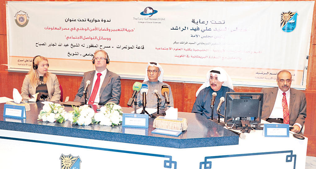 أقيمت بكلية العلوم الاجتماعية ندوة حوارية بعنوان «حرية التعبير وقضايا الأمن الوطني في عصر المعلومات ووسائل التواصل الاجتماعي» التي نظمتها وحدة الدراسات الأوروبية - الخليجية بالتعاون مع السفارة البريطانية بالكويت.