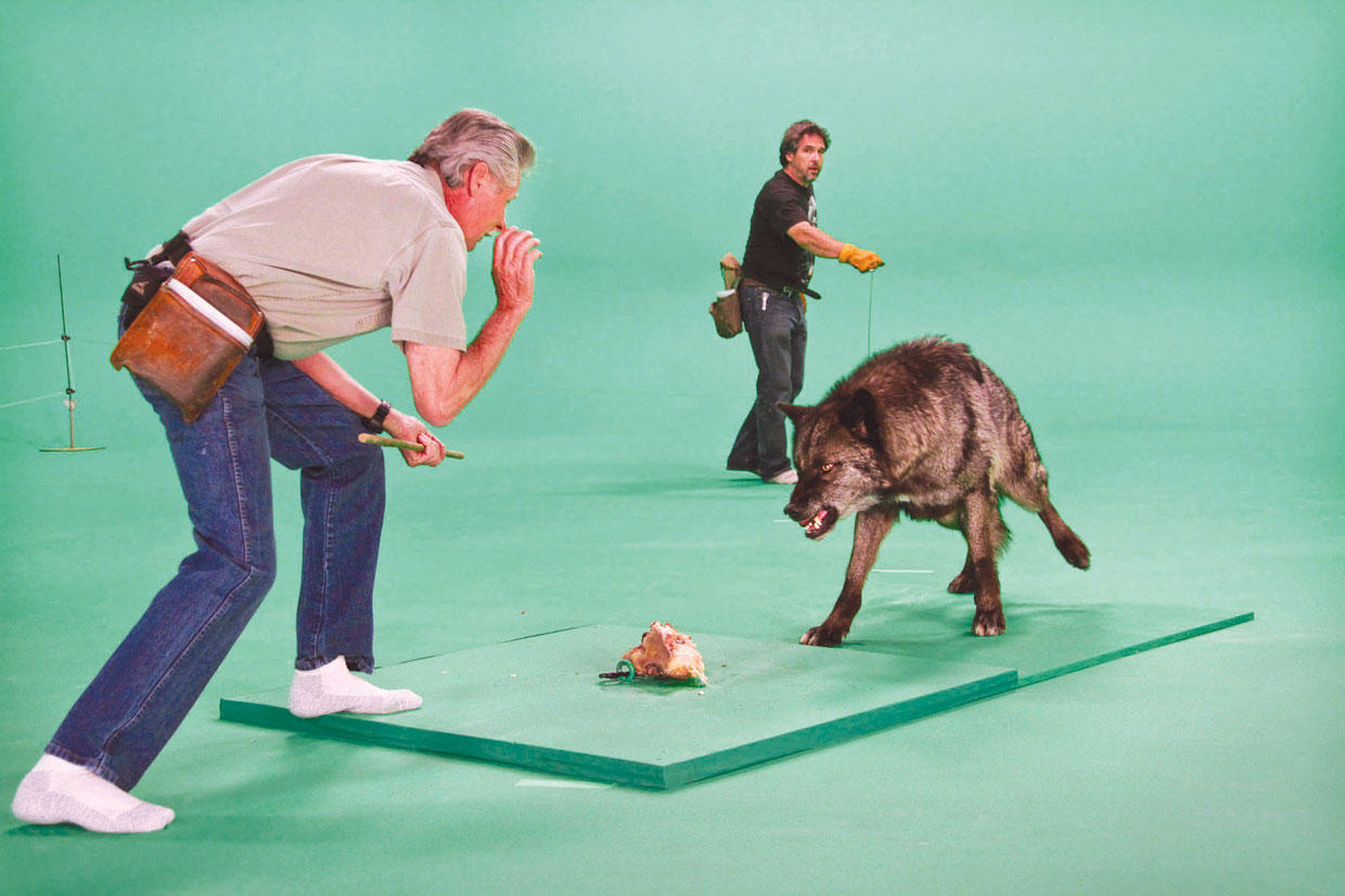 هرول النجم نحو وسادة صغيرة كانت موضوعة في وسط المسرح وتوقف عند العلامة التي رُسمت له. فأمره مدرّب الحيوانات المتمرس ستيف مارتن: {انظر إلى الكاميرا!}. فأدار «شادو» رأسه وكأنه محترف حقيقي وحدّق في الكاميرا بعينيه الصفراوين الثاقبتين: إنه الذئب الرمادي الذي ظهر في مسلسل True Blood على قناة HBO. ثم قال له مدرب آخر {أحسنت!} وهو يقذف له قطعة لحم.