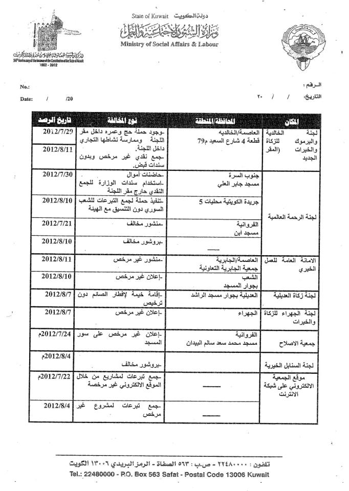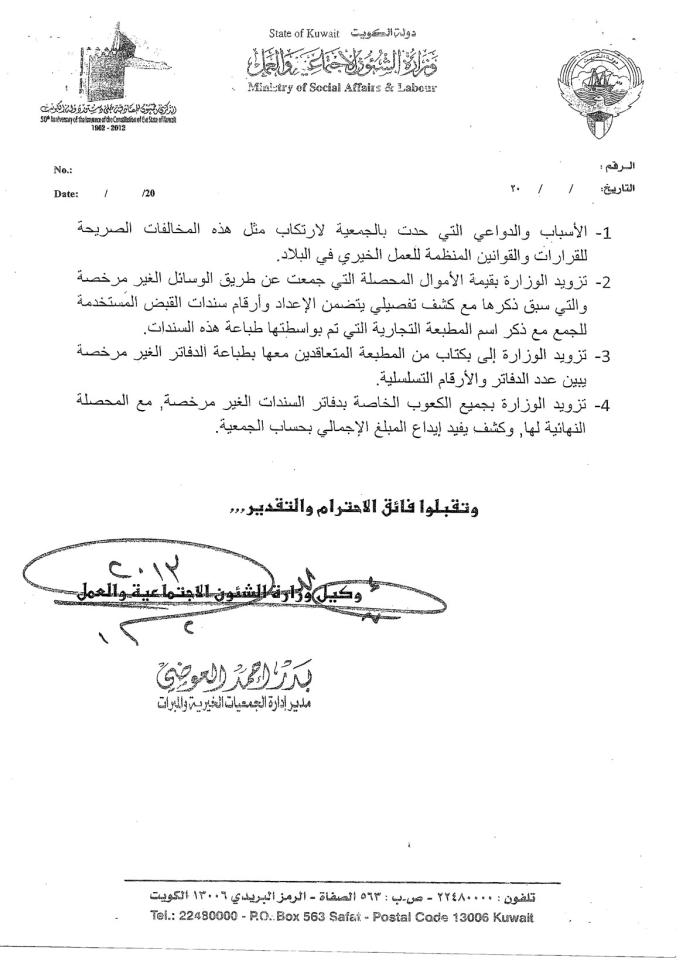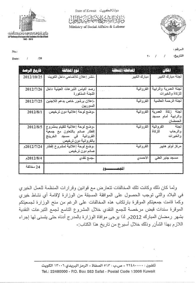 تصريحات مجافية للحقيقةوتؤكد "الجريدة" أن تصريحات رئيس مجلس إدارة جمعية الإصلاح الاجتماعي حول "عدم تلقي الجمعية لأي كتاب رسمي من وزارة الشؤون بشأن مخالفات اقترفتها" غير صحيحة، ومجافية تماما للحقيقة"، لاسيما أن "الجريدة" تحتفظ بكتاب رسمي صادر عن وزارة الشؤون الاجتماعية والعمل ممثلة في إدارة الجمعيات الخيرية والمبرات مؤرخ في 27 ديسمبر 2012، وموجه إلى رئيس الجمعية شخصيا بعنوان "المخالفات المرصودة عن المشروع التاسع لجمع التبرعات النقدية خلال شهر رمضان 2012"، وقد ضم هذا الكتاب ما لذ وطاب من المخالفات التي اقترفتها الجمعية خلال رمضان الماضي، ما يدحض تصريحات رئيس الجمعية، ويفرغها من محتواها. وجاء في مقدمة الكتاب المرسل من "الشؤون" إلى "الإصلاح"، "بالإشارة إلى الموضوع أعلاه، وإلحاقا إلى (كُتب) الوزارة المرسلة إليكم سابقا، في هذا الشأن نحيطكم علما بأن فرق متابعة ورصد وإزالة المخالفات المنبثقة عن لجنة متابعة النشاط الميداني للعمل الخيري في البلاد، قد حصرت مخالفات جمعيتكم الموقرة، واللجان التابعة لها خلال المشروع التاسع لجمع التبرعات"، بملاحظة عنوان الكتاب الموجه من الوزارة إلى الجمعية هناك (كُتب) وليس كتابا واحدا كما ادعى الرومي، موجهة من "الشؤون" إلى الجمعية بشان مخالفات أقترفتها خلال رمضان الماضي، هذه المخالفات وفقا للكتاب تمثلت في، جمع نقدي غير مرخص بسندات قبض غير مرخصة، وجمع نقدي غير مرخص دون وجود سندات قبض من الأساس، ما يدحض ادعاءات الرومي بشأن "التزام الجمعية الكامل بالإيصالات التي تتسلمها من وزارة الشؤون"، فضلا عن وجود حملات حج وعمره داخل بعض مقار اللجان التابعة للجمعية، وممارسة أنشطة تجارية واستغلال المقار في غير الأغراض التي أشهرت من أجلها، إضافة إلى استخدام حاضنات الأموال والجمع النقدي خارج مقار اللجان، وتنفيذ حملات جمع تبرعات مخالفة بدعوى نصرة الشعب السوري، فضلا عن العديد من الخالفات الجسيمة الأخرى التي تضمنها التقرير النهائي لجمع التبرعات النقدية خلال رمضان الماضي، الذي انفردت "الجريدة" بنشره الاسبوع الماضي.مخالفات صريحةوجاء أيضا في الكتاب الموجه من "الشؤون" إلى "الجمعية" والمذيل بتوقيع مدير إدارة الجمعيات الخيرية والمبرات في وزارة الشؤون بدر العوضي، "لما كانت هذه المخالفات سالفة الذكر، تتعارض والقوانين والقرارات المنظمة للعمل الخيري في البلاد، التي توجب الحصول على موافقة مسبقة من الوزارة لإقامة أي نشاط خيري، لاسيما أن جمعيتكم الموقرة قامت بارتكاب هذه المخالفات رغم منحها سندات قبض مرخصة للجمع النقدي خلال المشروع التاسع لجمع التبرعات النقدية خلال شهر رمضان الماضي، لذا يرجى موافاة الوزارة بالمدرج أدناه حتى يتسنى لها إجراء اللازم في هذا الشأن":الأسباب والدواعي التي حدت الجمعية الى ارتكاب مثل هذه المخالفات الصريحة للقرارات والقوانين المنظمة للعمل الخيري في البلاد، وتزويد الوزارة بقيمة الأموال المحصلة التي جمعت عن طريق الوسائل غير المرخصة، التي سبق ذكرها، مع تزويدها بكشف تفصيلي يتضمن أعداد وأرقام سندات القبض المستخدمة للجمع، مع ذكر اسم المطبعة التجارية التي تم بواسطتها طباعة هذه السندات، وتزويد الوزارة بكتاب من المطبعة المتعاقدة معها الجمعية، التي قامت بطباعة الدفاتر غير المرخصة، يوضح أعداد هذه الدفاتر وأرقامها التسلسلية، وتزويد الوزارة بجميع (الكعوب) الخاصة بدفاتر السندات غير المرخصة، مع المحصلة النهائية لها، مع تزويدها بكشف يفيد إيداع المبلغ الإجمالي في حسابات الجمعية.أخيرا كنا نأمل من "الإصلاح" الرد على كتب الوزارة التي تؤكد مصادر لـ"الجريدة" داخل الوزارة أن الجمعية لم تقم بالرد عليها حتى الآن، رغم مرور أشهر عدة على ارسال هذه الكتب، أو على أقل تقدير افادتها حول أسباب اقتراف مثل هذه المخالفات.