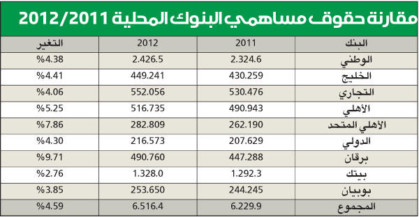وحل بنك برقان في المركز الأول من حيث الأكثر نموا في الاحتياطي العام، حيث نما احتياطي «برقان» بما نسبته 4.5 في المئة، إذ انه قدر بـ268.7 مليون دينار، وذلك خلال عام 2012، مقارنة مع احتياطي بلغ 256.9 مليونا، وذلك خلال عام 2011، أي بزيادة بلغت 11.7 مليونا، يليه البنك الاهلي الكويتي الذي بلغ نمو الاحتياطي العام بـ3.7 في المئة، إذ ارتفعت من 227.3 مليونا، ليصل إلى 235.8 مليونا، أي بزيادة بلغت 8.49 ملايين دينار. ويأتي بنك بيت التمويل الكويتي (بيتك) ثالثا من حيث نمو احتياطي البنك العام، إذ انه نما بنسبة 2.4 في المئة، حيث ارتفعت من 1.009 مليار دينار، وذلك خلال السنة المالية المنتهية في 2011، ليصل إلى 1.034 مليار دينار، وذلك خلال السنة المنتهية في 2012، أي بزيادة بلغت 25.1 مليون، يليه بنك الكويت الوطني، إذ إن الاحتياطي العام للبنك ارتفع من 1.012 مليار دينار، ليصل إلى 1.029 مليار دينار، أي بنسبة نمو بلغت 1.64 في المئة، وبزيادة بلغت 16.6 مليون دينار.وجاء بنك الخليج خامس البنوك من حيث نمو الاحتياطي العام، إذ ان الاحتياطي العام نما بما نسبته 1.63 في المئة، يليه بنك الاهلي المتحد بنمو ما نسبته 1.44 في المئة، ومن ثم يليه بنك الكويت الدولي بنسبة نمو بلغت 0.57 في المئة، ومن ثم يلي البنك التجاري الكويتي بنمو في الاحتياطي العام بلغ نسبته 0.38 في المئة.وانخفض احتياطي بنك بوبيان بنسبة طفيفة بلغت 0.26 في المئة، حيث انخفض الاحتياطي العام لبنك بوبيان من 62.42 مليون دينار، وذلك خلال عام 2011، ليصل إلى 62.26 مليونا أي بانخفاض قدره 165 ألف دينار.حقوق المساهمين أما بالنسبة لحقوق مساهمي البنوك المحلية فتصدر بنك برقان أيضا باقي البنوك المحلية من حيث الأكثر نموا، إذ ان حقوق مساهميه ارتفعت من 447.2 مليون دينار خلال عام 2011، لتصل إلى 490.7 مليونا خلال عام 2012، أي بنسبة نمو بلغت 9.7 في المئة، وبزيادة قدرها 43.4 مليون دينار، يليه البنك الاهلي المتحد بنمو ما نسبته 7.8 في المئة، إذ ان حقوق مساهمي «المتحد» بلغت 282.8 مليون دينار، مقارنة مع 262.1 مليون دينار، بزيادة بلغت 20.6 مليون دينار.وسجل البنك الاهلي الكويتي نموا في حقوق مساهميه بلغت نسبته 5.2 في المئة، حيث ارتفعت حقوق المساهمين من 490.9 مليون دينار، لتصل في نهاية العام الماضي إلى 516.7 مليون دينار، بزيادة بلغت 25.7 مليون دينار، يليه بنك الخليج بنسبة نمو في حقوق المساهمين بلغت 4.4 في المئة، إذ ان حقوق مساهمي «الخليج» بلعت 449.2 مليون دينار، مقارنة مع 430.2 مليونا، أي بزيادة قدرها 18.9 مليونا.وحل بنك الكويت الوطني خامسا من حيث الأعلى نموا في حقوق المساهمين، حيث ارتفعت حقوق مساهميه من 2.32 مليار خلال عام 2011، لتصل إلى 2.42 مليار، خلال العام الماضي، بزيادة قدرها 101.9 مليون دينار، وبنسبة نمو بلغت 4.38 في المئة.القانوني والاختياريويأتي احتياطي العام للبنوك وفقا لقانون الشركات التجارية، والنظام الأساسي للبنك، حيث يجبر القانون البنك تحويل ما نسبته 10 في المئة من ربحه السنوي، إلى الاحتياطي القانوني، ويسمى بالاحتياطي الإجباري، وذلك قبل مكافأة أعضاء مجلس الإدارة، وحصة مؤسسة الكويت للتقدم العلمي، وضريبة دعم العمالة الوطنية والزكاة، ويجوز للبنك اتخاذ القرار بإيقاف هذا التحويلات السنوية عندما يصل الاحتياطي إلى 50 في المئة من رأس المال المدفوع، أما الاحتياطي الاختياري فهو خيار للبنك بنسبة لا تتعدى أيضا الـ10 في المئة.وتمكن زيادة حقوق المساهمين الشركة من الارتكاز على قاعدة مالية صلبة، تضاف إلى الاحتياطيات للتوسع في أعمالها وزيادة عوائدها، الأمر الذي ينعكس إيجابيا على السهم والمساهم، بالإضافة إلى تقوية المركز المالي للشركة بواسطة زيادة حقوق الملكية يتيح للشركة زيادة توزيع الأرباح للمساهمين مستقبلا.