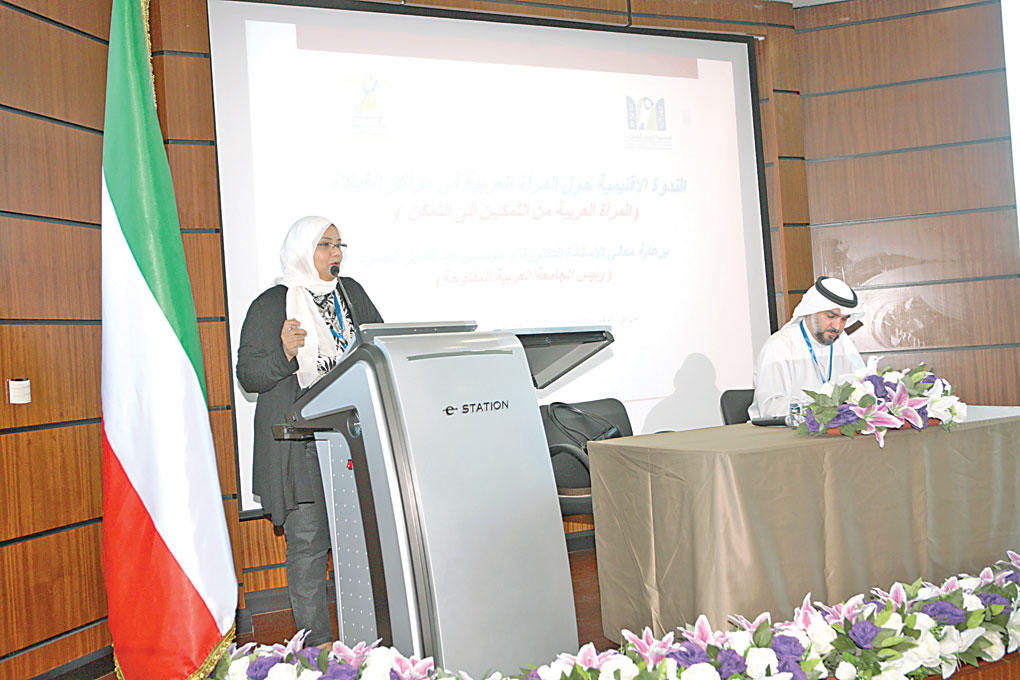 وذكرت الحمود: "أن المرأة اليوم برزت في دور الإعلام الإلكتروني كناشطة سياسية تتطرق للعديد من القضايا على نطاق داخلي أو في الخارج في مختلف دول الوطن العربي، ولوحظ أن لها مشاركة في مختلف الميادين السياسية والاجتماعية والتطوعية"، مضيفة: "أصبحت المرأة تحدد الرؤية المستقبلية من خلال تبني العديد من القضايا"، متمنية أن تشارك المرأة في تقلد المناصب القيادية والمشاركة في شتى المجالات.وشارك نائب مدير الجامعة د. مصطفى عشوي، خلال الجلسة الختامية التي ترأسها د. ناصر زائري، بدراسة مقارنة إقليمية لم تكتمل نتائجها بشكل نهائي، بمشاركة عدد من المفكرين والباحثين، وحملت عنوان "الاتجاهات نحو المرأة في مراكز القيادة بالبلدان العربية".واكد د. عشوي انه "لا ينبغي أن يحكم على الاتجاهات في موضوع المرأة العربية في مراكز القيادة، انطلاقا من موقف منمط قائم على التعميم دون دليل علمي يستند إلى استقراء الواقع، وجمع البيانات وتحليلها تحليلا موضوعيا، وعليه يمكننا القول وبقدر كبير من الثقة إن الاتجاهات في البلدان العربية خاصة نحو موضوع المرأة في مراكز القيادة، واتخاذ القرارات تختلف اختلافا جوهريا حتى في المنطقة الجغرافية الواحدة (في العالم العربي)".أبحاث ودراساتأما الجلسة الثانية فقد كانت لرئيس قسم التربية في الجامعة د. سبيكة بورسلي، التي اكدت دور المرأة في المجتمع الكويتي وسائر المجتمعات العربية في كلمة موجزة افتتحت خلالها الجلسة لتطلق العنان للمشاركين في عرض وتناول الابحاث والدراسات المقدمة.وبدأت المشاركة الأولى من الجزائر للاستاذ الدكتور بوفلجة غياب بدراسة عن "نظرة النساء القياديات للاتجاهات الاجتماعية نحوهن"، وهي دراسة ميدانية تناول خلالها الباحث في دراسته عينة من 17 امرأة قيادية، وقد أثبتت النتائج وجود اتجاهات سلبية نحو المرأة القيادية في المجتمع الجزائري، من خلال تقييم عينة البحث لعلاقاتهن المهنية مع العمال من ذكور وإناث على السواء، في حين عبرت النساء القياديات عن كفاءتهن وقدرتهن على التعامل مع الجوانب التقنية والمهنية.وكانت المشاركة الثانية من الكويت من رئيس الفريق الإعلامي لمجموعة 29 منى عبدالرزاق، وقدمت دراسة حول "تمكين المرأة في مجال العمل التطوعي"، تناولت خلالها الواقع والتحديات لمجموعة 29 التطوعية التي اكدت خلالها ان "للمرأة الكويتية تاريخا مشرفا في المجال التطوعي والانساني، وان مجموعتنا انطلقت من مادة 29 التي تنص على ان: الناس سواسية في الكرامة الانسانية، وهم متساوون لدى القانون في الحقوق والواجبات العامة، لا تمييز بينهم بسبب الجنس أو الأصل أو اللغة أو الدين". متغيرات ديموغرافيةاما المشاركة الثالثة فكانت من لبنان للاستاذة يارا عبدالله، وقدمت خلالها بحثا عن "المرأة القيادية في لبنان"، حيث استخدمت الاحصاء الوصفي والاستدلالي لاختبار وتحليل البيانات التي قامت بجمعها، مؤكدة في دراستها ان "الموظفات يتمتعن بإيجابية أكثر في ما يخص القيادة النسائية في جميع انحاء المتغيرات الديموغرافية المختلفة على النقيض من قرينتها غير الموظفة".وقدمت الباحثة والمفكرة نجلاء الحميد من السعودية، في المشاركة الرابعة، "دراسة الذكاء الوجداني وعلاقته بالمهارات القيادية لدى القيادات النسائية في السعودية"، حيث اكدت أن الذكاء الوجداني من المفاهيم التي ظهرت في علم النفس وفي الفكر الاداري بشكل عام.وقالت الحميد إن الذكاء الوجداني يسهم في زيادة قدرة الفرد أو المدير على ادارة مشاعره ومشاعرالآخرين بغرض التأثير فيهم، لاسيما ان النهوض بالقدرات القيادية للمرأة السعودية، وتمكينها من المشاركة في عملية التنمية أصبح مطلباً رئيسياً ترتكز عليه التوجهات التنموية للدولة.وكانت المشاركة الخامسة من السعودية ايضا إذ قدم د. معن عبدالباري دراسة عن المرأة اليمنية ودورها القيادي في اليمن، تناولت تقديم عرض تحليلي موجز لإظهار الدور القيادي للمرأة اليمنية في عملية التنمية، وتحديد العوامل المساعدة والمعرقل