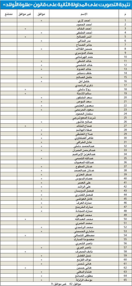 رغم تلويح الحكومة برده، أقر مجلس الأمة قانون منح العلاوة الاجتماعية وعلاوة الاولاد للموظفة الكويتية في مداولته الثانية وأحاله الى الحكومة في بداية جلسة أمس، وأقر اربع اتفاقيات دولية بينها اتفاقية الربط الكهربائي بين دول مجلس التعاون الخليجي.وأكد وزير الدولة لشؤون مجلس الوزراء الشيخ محمد العبدالله أن إقرار زيادة مالية من خلال المجلس تعد على صلاحيات السلطة التنفيذية باعتباره من اختصاص الديوان الخدمة المدنية، محذراً من انه «في حال الموافقة عليه، وعدم تأجيله، وعدم إمهال الحكومة فترة أسبوعين لإقرار العلاوات بقرار وليس بقانون، فسنضطر الى الاعتراض عليه».ورفض المجلس مقترحاً نيابياً بتخصيص ساعة من الجلسة لمناقشة تصريحات الشيخ احمد صباح السالم والنائب السابق احمد السعدون الأخيرة، بعد حدوث تباين نيابي بشأن الطلب المقدم واعتراض الحكومة عليه.ووافق المجلس على مشروع قانون في شأن تشجيع الاستثمار المباشر في مداولته الاولى. واعلن وزير التجارة والصناعة انس الصالح ان قانون المستثمر الاجنبي معمول به منذ عشر سنوات وتم بموجبه تنفيذ 14 مشروعا، بقيمة استثمارات بلغت مليارا و74 مليون دينار، كما وافق على مشروع القانون بتعديل بعض أحكام المرسوم بقانون رقم 10 لسنة 1979 في شأن الإشراف على الاتجار بالسلع وتحديد أسعار بعضها في مداولته الاولى.افتتح نائب رئيس مجلس الأمة الجلسة الساعة التاسعة وتلا الأمين العام أسماء الأعضاء الحاضرين والمعتذرين والغائبين بدون إذن أو أخطار.وانتقل المجلس إلى المداولة الثانية على المشروع بقانون بشأن علاوة الأولاد والعلاوة الاجتماعية للموظفة الكويتية.وطلبت الوزيرة رولا دشتي تقديم البنود 19، 16، 20، 21، 22 بعد بند العلاوة الاجتماعية وعلاوة الأولاد.وقالت مقررة اللجنة المالية النائبة صفاء الهاشم ان مشروع القانون يمنح العلاوة الاجتماعية، فالتقرير المقدم يتكلم عن أهم بنود التعديل بعد حضور ممثلي ديوان الخدمة المدنية وممثلي التأمينات الاجتماعية، باضافة مادة جديدة تمنح الموظفة العلاوة الاجتماعية اذا كان زوجها لا يتقاضى هذه العلاوة من الخزانة العامة.وقال رئيس اللجنة النائب يوسف الزلزلة: من المهم انصاف المرأة الكويتية التي اراد لها الله عز وجل ان تتزوج غير كويتي واصبح لها ابناء، ومن المهم أن نقر ما جاء في هذا القانون، واللجنة اعطت الحق للمرأة الكويتية، وهذا انصاف وأرجو ان تصوت الحكومة على القانون.فتح الباب على مصراعيهبدوره قال النائب نواف الفزيع: وفق نص المادة 10 من الدستور والمادة 11 سيكون لي موقف مغاير تمسكا بالنصوص الدستورية فعندما نقر علاوة الاولاد لم يكن الهدف منها أن تعطى للزوج أو الزوجة وإنما تذهب لابناء الزوج، ومع احترامي للمرأة الكويتية المتزوجة من غير كويتي فإن هذا القانون به "تزيد" وبذلك نشجع الكويتيات على الزواج من غير كويتيين، وصار كل همنا وتركيزنا المرأة المتزوجة من غير كويتي، سيوصلنا ذلك الى فتح الباب على مصراعيه للزواج من غير كويتيين، ارجو تفهم حقيقة ذلك، واتمنى أن نركز على حماية الاسرة الكويتية وهي قائمة على الأبناء الكويتيين وارجو الغاء النص الخاص بالعلاوة الاجتماعية للكويتية المتزوجة من غير كويتي والابقاء على النص الاصلي للمشروع.من جهته، قال النائب حسين القلاف ان كلام الفزيع غير مضبوط، ولا يشجع كما يقول الكويتية على أن تتزوج غير كويتي، مشيرا إلى أن المرأة الكويتية مهضوم حقها، ومبدأ العدالة والمساواة بين الرجل والمرأة يجب ان يتحقق.وتساءل القلاف: "هل الكويتي على رأسه ريشة حتى يحصل على العلاوة ولا تحصل عليها المرأة؟"، مشددا على أن موقفه ليس مزايدة وإنما مبدأ، معتبرا الحكومة فاشلة.وقال الوزير محمد العبدالله: "اطلب شطب وصف الحكومة بأنها حكومة فاشلة".ورد القلاف: "ليس المهم أن تشطب من المضبطة لكن عليكم ان تثبتوا فعليا انكو (مو فاشلين).إلى ذلك قال النائب فيصل الدويسان ان "القانون حقق مبتغاه، ولا أعلم سر تحسس الحكومة من كلمة فاشلة وهو وصف سياس
