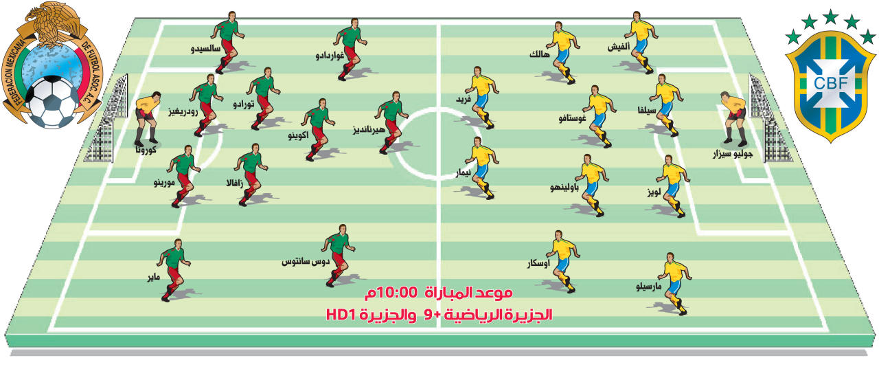 يسعى المنتخب البرازيلي، بطل النسختين الاخيرتين والمضيف، الى حسم تأهله للدور نصف النهائي من كأس القارات، وذلك عندما يتواجه اليوم مع المكسيك في الجولة الثانية من منافسات المجموعة الاولى.على "ستاديو بلاسيدو اديرالدو كاستيلو" في فورتاليزا، يبحث المنتخب المضيف، الفائز باللقب ثلاث مرات اعوام 1997 (على حساب استراليا 6-صفر) و2005 (على حساب الارجنتين 4-1) و2009 (على حساب الولايات المتحدة 3-2)، عن التأكيد بأن العرض القوي الذي قدمه في الجولة الاولى امام المنتخب الياباني بطل اسيا (3-صفر) لم يكن وليد الصدفة وذلك من خلال التخلص من عقبة المكسيك التي كانت استهلت مشوارها بالخسارة امام ايطاليا.