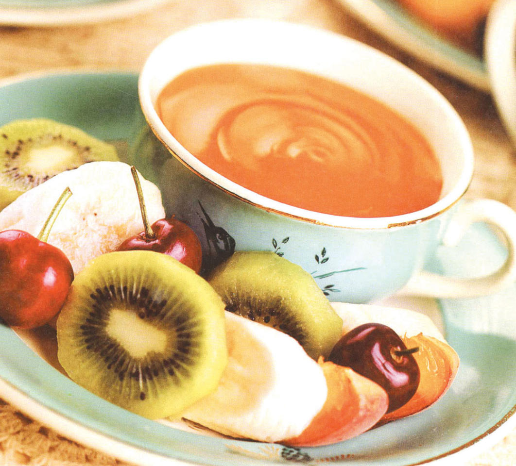سكر بنيسكر أبيضكريمافانيليا سائلةزبدةفواكه منوعة ومقطعةالكمية1/2 كوب 1/2 كوب1/2 كوبملعقة صغيرةملعقتانكوب كبيرالطريقة-1 في إناء عميق، ضعي السكر والزبدة على نار متوسطة لمدة 5 دقائق من دون تقليب.-2 أضيفي الكريما والفانيليا وقلبي المزيج لدقائق قليلة.-3 ارفعي المزيج عن النار واتركيه حتى يبرد، ثم صبيه في أطباق التقديم.-4 قدمي الحلوى مع الفاكهة المنوعة من موز وكيوي وكرز وخوخ.