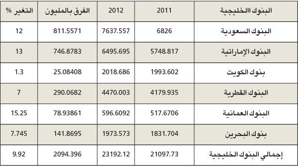 تخطت البنوك الخليجية للعام الثاني على التوالي الأرباح القياسية التي حققتها في عام 2007، والتي بلغت نحو 20 مليار دولار، لتحقق في عام 2011 نحو 21.09 مليار دولار، ارتفعت إلى 23.192 مليار دولار في 2012.