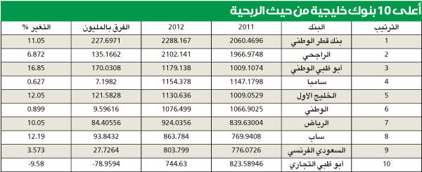 الأعلى ربحيةومن حيث أعلى 10 بنوك ربحية، تصدر بنك قطر الوطني المرتبة الأولى، إذ تمكن من تحقيق أرباح قدرها 2.288 مليار دولار، تلاه بنك الراجحي السعودي بربحية بلغت 2.102 مليار دولار، ثم بنك أبوظبي الوطني بـ1.179 مليار دولار، وبنك سامبا السعودي بربحية قدرها 1.154 مليون دولار، وبنك الخليج الاول الاماراتي بـ1.13 مليار دولار، ثم البنك الوطني الكويتي بـ1.076 مليار دولار، وبنك الرياض بـ924 مليون دولار وبنك ساب بـ863 مليون دولار ثم البنك السعودي الفرنسي بـ803 مليون دولار وأخيراً بنك أبوظبي التجاري بـ744 مليون دولار. أرباح قياسيةومن جانبها، أكدت مصادر مصرفية أن البنوك الخليجية تخطت للعام الثاني على التوالي الارباح القياسية التي حققتها عام 2007 والتي بلغت نحو 20 مليار دولار لتحقق في عام 2011 نحو 21.09 مليار دولار ارتفعت إلى 23.192 مليار دولار في 2012 مدفوعة بنمو صافي الارباح التشغيلة لها مع الانخفاض الملوحظ لنسب احتجازها للمخصصات.واشارت المصادر إلى أن تخفيف قبضة البنوك المركزية الخليجية على التشدد في اجبار البنوك على أخذ مخصصات، كان له الأثر في زيادة ارباحها، خاصة وان بعض البنوك وصلت مخصصاتها إلى نسبة 100 في المئة مقارنة مع ديونها المتعثرة والمعدومة مما حقق لها الاكتفاء من بناء مخصصات جديدة، مؤكدة أن خفض المخصصات يعطي مؤشرا قويا على تحسن أوضاع البنوك الخليجية مع الدعم الحكومي المستمر لها.وبينت المصادر تحسن البيئة التشغيلية للقطاع المصرفي الخليجي من مواصلة النمو الاقتصادي وزيادة الانفاق الحكومي في ظل ثبات اسعار النفط، بالاضافة الى تحسن اسعار الاصول وإعادة هيكلة معظم الديون المتعثرة وحجز المخصصات الكافية لها.وتوقعت المصادر أن يشهد عام 2012 طفرة حقيقية على مستوى الكويت بشكل خاص والخليج بشكل عام، في توسعات البنوك بأنشطة التمويل بدخولها في تمويل المشاريع الحكومية التي اعلنت عنها بعض الحكومات الخليجية وفي مقدمتها الكويت.
