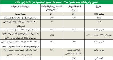 بلغ إجمالي تكاليف المنح والزيادات والكوادر والعلاوات التي أقرت خلال السنوات السبع الماضية نحو 7.513 مليارات دينار، تحملتها الدولة دون وجود مردود اقتصادي لها، بل إنها ساهمت في ارتفاع معدلات التضخم.أكد مصرفيون أن ضغط أعضاء مجلس الامة على الحكومة لتمرير اسقاط فوائد قروض المواطنين يعد احدى حلقات سياسة استنزاف المال العام التي بدأت منذ عدة سنوات، بهدف ارضاء المواطنين بقرارات شعبوية، دون الاهتمام بالتنمية الحقيقية أو بالعدالة الاجتماعية بين المواطنين، وذلك عبر ضخ المنح والزيادات والعلاوات دون مقابل حقيقي أو زيادة في الانتاج، أو إقامة مشاريع تنموية ذات عوائد اقتصادية واجتماعية على جميع المواطنين.وحسب احصائية أعدتها «الجريدة» بلغ اجمالي تكاليف المنح الاميرية والزيادات والكوادر والعلاوات التي تم اقراراها خلال السنوات السبع الماضية نحو 7.513 مليارات دينار تحملتها ميزانية الدولة دون وجود مردود اقتصادي لها بل انها تصب في مصلحة ارتفاع معدلات التضخم، لاسيما مع صرف المواطنين لأغلبها على السلع الاستهلاكية وهو ما تؤكده التقارير الاقتصادية التي ترصد زيادة الانفاق الاستهلاكي للمواطنين، بالرغم من استمرار الازمة المالية والاقتصادية خلال هذه الفترة.فالبنسبة الى الكوادر والزيادات بلغ اجمالي ما تم اقراره من بدالات وكوادر للفترة من بداية 2005 إلى نهاية مارس 2011 نحو 3.577 مليارات دينار، في حين تم اقرار زيادات أخرى في مارس 2011 بقيمة بلغت 1.4 مليار دينار، لــ17 الف موظف، وللمعلمين الكويتيين والوافدين، ومساعدي المهندسين والاداريين، كما تم اقرار زيادة في العلاوات واقرار علاوة غلاء المعيشية عام 2008 بقيمة بلغت 380 مليون دينار. أما بالنسبة للمنح التي تم اقرارها من عام 2006، فان أول منحة كانت في 24 يوليو 2006 بقيمة 200 دينار إلى كل مواطن بتكلفة اجمالية بلغت نحو 200 مليون دينار، بقيمة 120 دينارا لكل مواطن، ليصل اجمالي تكاليفها الى نحو 380 مليون دينار، كما قامت الحكومة في عام 2009 بالاكتتاب نيابة عن المواطنين بـ760 مليون سهم لبنك وربة بقيمة 76 مليون دينار بقيمة اسمية 100 فلس للسهم مدفوعة بالكامل وتوزع بالتساوي على المواطنين الكويتيين المسجلين بسجلات الهيئة العامة للمعلومات المدنية حتى 4 أكتوبر 2009 وذلك بخلاف حصة الهيئة العامة للاستثمار البالغة 240 مليون سهم.وفي 24 فبراير 2011 تم صرف منحة أميرية بقيمة 1000 دينار لكل مواطن، وبتكلفة اجمالية بلغت نحو مليار دينار اضيف إليها صرف الدعم التمويني مجاناً بتكلفة اجمالية بلغت 230 مليون دينار.مردود سلبيوبين المصرفيون أن مواصلة الحكومة انفاق هذه المبالغ على بنود الزيادات والكوادر والمنح أمر خطير وسيكون له مردود سلبي على الجوانب الاقتصادية والاجتماعية في الكويت، لافتين إلى ان الضغط الذي يمارسه مجلس الامة على الحكومة لاسقاط فوائد القروض على المواطنين يعد احدى حلقات مسلسل اهدار المال العام على بنود استهلاكية ليس لها مردود اقتصادي بل انها ذات تأثير اجتماعي سلبي، حيث سيساعد ذلك على إنشاء جيل جديد من المواطنين لديهم ثقافة استهلاكية غير مسؤوله، لان هذا القرار سيشجعه على الاقتراض والاستهلاك وليس الانتاج، ودون التزام منه بالسداد.وأيدوا موقف البنك المركزي الرافض لاسقاط القروض أو فوائدها، والذي اعتبر ان مثل هذه القرارات ستؤدي الى اخلال بالعدالة الاجتماعية وستؤثر سلبياً في القطاع المصرفي، ويمس استقلالية المركزي ويحد من قدراته على اتخاذ قرارات مهنية وفنية صحيحة، مقابل تدخلات حكومية ونيابية تسعى لمكاسب سياسية، كما سيؤثر أيضاً على نظرة وثقة المتعاملين مع القطاع المصرفي، سواء محليا أو اقليميا أو عالميا، بسبب عدم استقراره امام المطالب السياسية.ودعوا إلى معالجة قضية القروض دون أن يتم تحميل ميزانية الدولة مزيدا من المصروفات والتكاليف، مشيرين إلى وجود عدة اقتراحات تم طرحها بهذا الشأن مثل تعديل ضوابط وشروط صندوق المعسرين بهدف زيادة شريحة المستفيدين، وذلك بزيادة مبلغ القرض، و