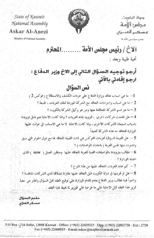 في سابقة على صعيد السؤال البرلماني، وجه ثلاثة نواب سؤالا برلمانيا الى نائب رئيس مجلس الوزراء وزير الدفاع الشيخ أحمد الخالد عن اسباب تعاقد الوزارة مع عربات الكشف والاستطلاع "فوكس 2"، بنفس الصيغة ونفس المحتوى ونفس الكلمات والعبارات، بل وعلامات الترقيم، ولم يلاحظ اي اختلاف سوى اسم مقدم السؤال، اذ تبدل بين النواب نواف الفزيع وعسكر العنزي ومحمد البراك.ويبدو مفهوما سبب توجيه النواب الثلاثة في نفس التوقيت هذا السؤال الى وزير الدفاع، الذي لم يتغير في صياغته حتى كلمة الأخ رئيس مجلس الأمة، إذ يتمثل القصد من توجيه هذا الكم هو الضغط على الوزير من أجل التراجع عن هذه الصفقة، لكن يبقى غير المفهوم هو سبب توجيه نص السؤال بنفس الصيغة، لأن اجابة الوزير ستكون في النهاية واحدة، على الاسئلة الثلاثة.