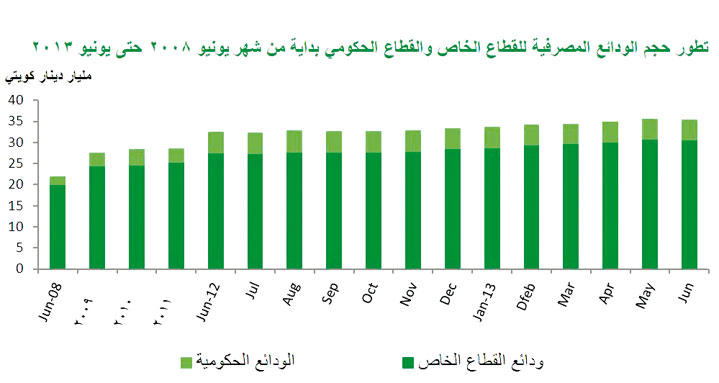 قال تقرير لبيت التمويل الكويتي (بيتك) انه على الرغم من نمو اجمالى الودائع بشكل سنوي بنسبة 9 في المئة في يونيو الماضي حيث بلغت 2.9 مليار دينار بالمقارنة بمقدارها في يونيو 2012 (حوالي 32.5 مليار دينار) فإن إجمالي الودائع المصرفية الحكومية وودائع القطاع الخاص، شهدت تراجعا خلال شهر يونيو 2013 بنحو نصف في المئة (0.5 في المئة) نتيجة لانخفاض الودائع الحكومية بنحو 1.5 في المئة خلال شهر يونيو وانخفاض ودائع القطاع الخاص بأقل من نصف في المئة (0.3 في المئة) خلال نفس الشهر مقارنة بقيمتها المسجلة خلال شهر مايو 2013، وفي ما يلي التفاصيل: تراجع إجمالي الودائع الحكومية وودائع القطاع الخاص بحوالي نصف في المئة (0.5 في المئة) بمقدار 169 مليون دينار ليسجل نحو 35.4 مليار دينار خلال يونيو 2013 مقارنة بارتفاع نحو 2 في المئة بحوالي 700 مليون دينار خلال شهر مايو 2013 إذ بلغ إجمالي الودائع المصرفية حوالي 35.6 مليار دينار. وقد بلغ إجمالي عرض النقود إلى إجمالي الودائع المصرفية الخاصة والحكومية ما نسبته حوالي 90.5 في المئة في يونيو 2013، مقارنة بنسبة بلغت 90.4 في المئة خلال مايو 2013 وما نسبته 88.6 في المئة في يونيو 2012. وفيما يخص ودائع القطاع الخاص فقد سجلت تراجعاً طفيفاً خلال شهر يونيو 2013 بأقل من نصف في المئة (0.3 في المئة) محققة انخفاضا بلغت قيمته حوالي 97 مليون دينار لتسجل نحو 30.5 مليار دينار خلال يونيو 2013 مقارنة بارتفاع بنحو 2 في المئة حوالى 584 مليون دينار خلال شهر مايو 2013 ، إذ سجل إجمالي الودائع المصرفية للقطاع الخاص حوالي 30.6 مليار دينار في مايو، وحققت نمواً سنوياً عن قيمتها في يونيو 2012 بنسبة 11 في المئة بحوالي 3 مليار دينار حيث سجلت نحو 27.5 مليار دينار في يونيو 2012. بينما ارتفعت حصة إجمالي الودائع المصرفية الخاصة إلى إجمالي عرض النقود بمفهومها الأوسع م3 بنسبة طفيفة حيث بلغت حوالي 95.3 في المئة خلال يونيو 2013 ، مقارنة بنحو 95.2 في المئة في مايو 2013 وما نسبته 95.6 في المئة في يونيو 2012، وتتكون ودائع القطاع الخاص من مجموع الودائع بالعملة المحلية والودائع بالعملات الأجنبية حيث تشمل الودائع بالعملة المحلية ثلاثة أنواع من الودائع وهي الودائع تحت الطلب والودائع الإدخارية والودائع لأجل. ودائع القطاع الخاص وأضاف التقرير: باستعراض تطور مكونات ودائع القطاع الخاص حسب أنواعها خلال شهر يونيو من عام 2013 نلاحظ استمرار ارتفاع الودائع تحت الطلب حيث ارتفعت بنسبة قدرها 2.7 في المئة بحوالي 182 مليون دينار لتسجل نحو 7 مليار دينار خلال يونيو 2013 مقارنة بارتفاع نسبته 2.3 في المئة اى 156 مليون دينار إذ سجلت نحو 6.8 مليار دينار في مايو 2013. أما ودائع الادخار فقد سجلت انخفاضاً للشهر الثاني على التوالي بنسبة قدرها 2 في المئة بحوالي 98 مليون دينار حيث سجلت قيمتها نحو 4.6 مليارات دينار خلال يونيو مقارنة بانخفاض نسبته 3 في المئة بحوالي 148 مليون دينار حيث بلغت قيمتها نحو 4.7 مليارات دينار في شهر مايو، في حين سجلت ودائع القطاع الخاص لأجل تراجعاً بنحو 2 في المئة وبمقدار 311 مليون دينار حيث سجلت حوالي 15.8 مليون دينار خلال شهر يونيو 2013 مقارنة بنمو بلغت نسبته 4 في المئة مرتفعة بنحو 652 مليون دينار حيث حققت نحو 16 مليار دينار في شهر مايو 2013. ونتيجة لما سبق فقد تراجعت ودائع القطاع الخاص بالعملة المحلية خلال يونيو 2013 بأقل من واحد في المئة (0.8 في المئة) وبحوالي 226 مليون دينار حيث سجلت حوالي 27.5 مليار دينار في يونيو 2013، مقارنة بارتفاعها فى مايو بنسبة 2.4 في المئة اي نحو 659 مليون دينار حيث سجلت حوالي 27.7 مليار دينار، بينما حققت ودائع القطاع الخاص بالعملات الأجنبية نمواً بنسبة بلغت 4.5 في المئة بارتفاع سجل نحو 130 مليون دينار حيث بلغت قيمتها نحو 30 مليار دينار خلال يونيو 2013 مقارنة بنسبة انخفاض قدرها 2.5 في المئة وبحوالي 76 مليون دينار إذ بلغت نحو 28.9 مليار دينار خلال مايو 2013. الودائع الادخارية أما على مستوى النمو السنوي، فقد حققت ودائع القطاع الخاص تحت الطلب نمواً سنوياً نسبته 18.6 في المئة ومقداره حوالي مليار دينار فى يو
