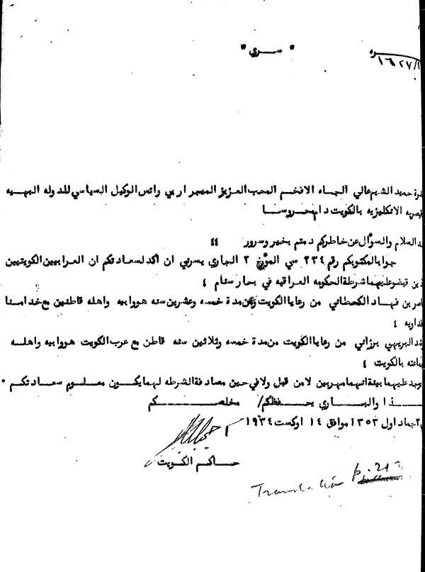 وهنا أود أن أؤكد أن هدفي من عرض هذه الوثائق هو التوثيق التاريخي لا تشويه صورة العراق الشقيق، فهذه الوثائق لا يجب إخفاؤها في الملفات والأدراج، بل ينبغي لها أن ترى النور حتى لا نهمل أي شيء من تاريخنا.وثيقتنا اليوم كتبها الشيخ أحمد الجابر الصباح أمير الكويت الراحل، خاطب فيها المعتمد البريطاني في الكويت، وذلك في عام 1934م، وذكر أن اثنين من رعايا الكويت تعرضا لهجوم مسلح من مجموعة من الشرطة العراقية، حيث أصابت أحدهما واقتادت الآخر إلى السجن بالبصرة، وقاموا بتعذيب المأسور لإجباره على الكذب عند التحقيق معه في مركز الشرطة، حتى لا تعاقبهم إدارة الشرطة على فعلتهم.وطلب الشيخ أحمد من المعتمد البريطاني أن يتدخل في الموضوع وأن يعيد الحق إلى أصحابه، خصوصاً أن المصاب قد توفي وأن الجمال (البعارين) المملوكة للكويتيين قد بيعت في البصرة. وإليكم نص رسالة الشيخ أحمد الجابر:"حضرة حميد الشيم عالي الجاه الأفخم المحب العزيز ا ربي واتس الوكيل السياسي للدولة البهية القيصرية الإنكليزية بالكويت دام محروساً،،، بعد السلام والسؤال عن خاطركم دمتم بخير وسرور... نفيد سعادتكم أن ناصر بن فهاد ومرشد البريهي من عرب الكويت جايين من عرب الكويت الذين على..... قاصدين الجهرة، معهم ستة بعارين وسلاحهم، فلما وصلوا بحار سنام في يوم 4 الجاري صادفوهم سيارتين فيهم شرطة، وبدون إنذار أطلقوا عليهم الرصاص، وطاح ناصر صويب، وقبضوا عليهم، وودوا المصوب الى المستشفى بالبصرة والثاني سلموه للسجن، وبعارينهم ستة باعوهم بالزبير. وعمل فيهم الشرطة عمل وحشي حيث اطلقوا عليهم الرصاص بدون سبب، وهم رعّاية مقبلين على بعارين خالية. ثم لما طاح ناصر صويب وقبضوا على خويّه مرشد، أخذوا يجلدونه من غير رأفة قصدهم يقول نحن رامين، حتى يتخلصون من هذه الجناية المؤلمة. وبعد الضرب الشديد أوعدهم ان يقول ما أرادوه منه. فلما وصلوا به لمرجع التحقيق بيّن الواقع وما جرى عليهم من عمل الشرطة وما كبدوه (كابدوه) من العذاب حتى يقول نحن رامين. وهذه مسألة مكدرة ولا هو من طريق الإنصاف ان ناس رعّاية قادمين من عربهم ماشين في طريقه، م يعاملونهم رجال حكومة مجاورة شقيقة في هالمعاملة الوحشية التي ما تصورناها. فقد جاء خبر الآن ان المصوب مات في المستشفى وجانا أخوه وأقاربه يشتكون على قضية الميت وبعارينه المبتاعة بالزبير. بناء عليه نرجوكم ان ترفعون هذه القضية للمراجع الايجابية لأجل الوقوف على الحقيقة......... بحق الجانين واسترجاع البعارين المنهوبة، هذا والباري يحفظكم. في 24 ربيع الثاني 1353هـ موافق 6 اوكست 1934م".ويبدو أن الوكيل السياسي البريطاني رد على كتاب الشيخ أحمد بتاريخ 3 ربيع الثاني بعد أن تسلم رداً من البصرة، وسأله عن احتمال أن يكون الكويتيان ناصر بن فهاد ومرشد البريهي من المهربين المخالفين للقانون، فرد عليه الشيخ أحمد فوراً في نفس اليوم نافياً أن يكون ناصر ومرشد من المهربين، وإليكم نص الرسالة:"جوابا لمكتوبكم رقم 234 سي المؤرخ 3 الجاري يسرني أن أؤكد لسعادتكم ان العرابيين الكويتيين الذين قبضت عليهما شرطة الحكومة العراقية في بحار سنام: ناصر بن فهاد الكحطاني (القحطاني) من رعايا الكويت من مدة خمسة وعشرين سنة هو وأبيه وأهله قاطنين مع خدامنا الفداوية، ومرشد البريهي برزاني من مدة خمسة وثلاثين سنة قاطن مع عرب الكويت هو وأبيه وأهله وجماعته بالكويت،ولا يوجد عليهما بينة أنهما مهربين لا من قبل ولا في حين مصادفة الشرطة لهما، يكون معلوم سعادتكم، هذا والباري يحفظكم. في 3 جماد أول 1353هـ موافق 14 اوكست (اغسطس) 1934م".ويؤسفني أنني لم أعثر على باقي المراسلات التي تتعلق بهذه القضية، ولا يمكنني أن أعرف ماذا حصل بعد ذلك، ولكنني سأعرض في الأسبوع المقبل قضية أخرى مشابهة لهذه القضية إن شاء الله.