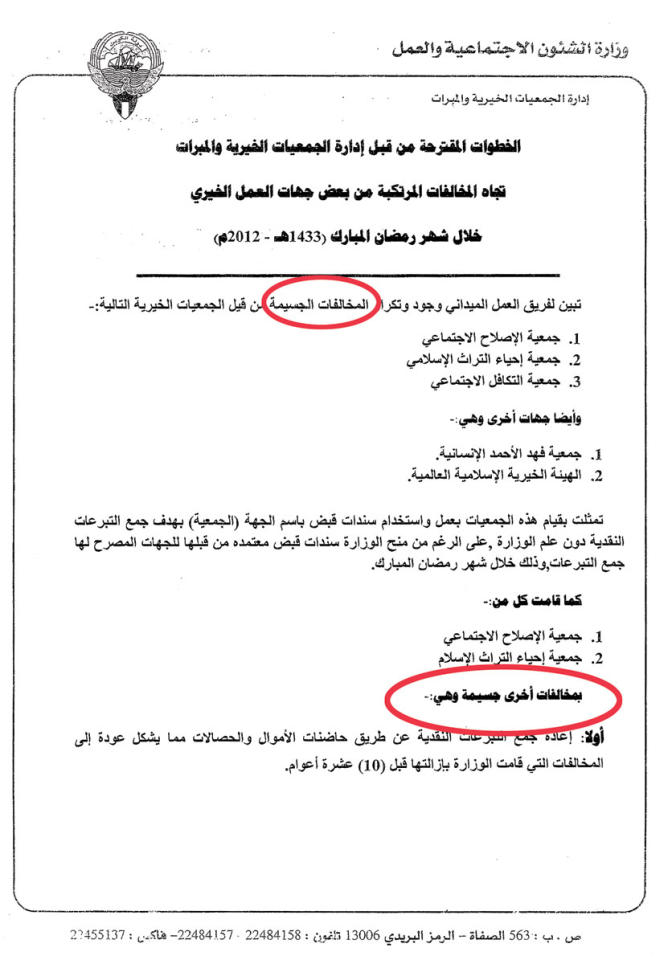 وبشأن المخالفات التي رصدها فريق عمل ومتابعة ورصد مخالفات الجمعيات الخيرية والمبرات، والمشكل من قبل وزارة الشؤون، والذي أوصى وزير الشؤون بإحالة الجمعيات المخالفة للقوانين إلى القضاء، لاقترافها مخالفات جسيمة تمثلت في استخدام سندات قبض مخالفة، بهدف جمع التبرعات النقدية دون علم الوزارة، والجمع النقدي غير المرخص دون استخدام سندات قبض من الأساس، فضلا عن جمع تبرعات نقدية عن طريق حاضنات الأموال والحصالات، واستغلال مقار اللجان التابعة لهما في غير الاغراض التي أشهرت من أجلها، وممارسة أنشطة تجارية غير مرخصة داخلها، قال: «إن هذه المخالفات لا ترقى إلى مستوى الجسيمة، والسواد الأعظم منها يتمثل في نشر اعلانات جمع تبرعات بطرق مخالفة».