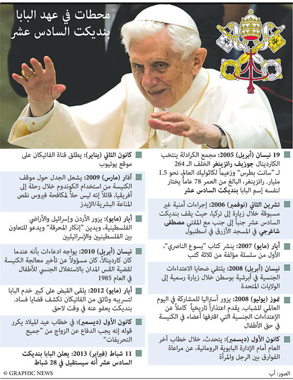 فوجئ العالم أمس، بإعلان نبأ استقالة بابا الفاتيكان بنديكتوس السادس عشر، بعد مرور أقل من ثماني سنوات أمضاها في سدة البابوية خلفاً للراحل يوحنا بولس الثاني. وقد عزا البابا سبب استقالته إلى تقدمه في العمر، وعدم تمكنه جسدياً من القيام بمتطلبات منصبه الرفيع.في خطوة غير مسبوقة في تاريخ الكنيسة الكاثوليكية المعاصر، أعلن البابا بنديكتوس السادس عشر، أمس، استقالته في خطاب ألقاه باللاتينية خلال مجمع كرادلة عُقد في الفاتيكان.وقال الناطق الرسمي باسم الفاتيكان الأب فيديريكو لومباردي إن "البابا أعلن أنه سيتخلى عن مهامه في الساعة 20.00 (19.00 تغ) في 28 فبراير وعندها تبدأ مرحلة: الكرسي الشاغر". وأضاف المتحدث للصحافيين: "نتوقع أن يكون لدينا حبر أعظم جديد قبل عيد الفصح" المصادف 31 مارس، مشيراً إلى أن مجمع الكرادلة سينعقد في الأيام الـ15 إلى العشرين التي تلي الاستقالة.ومن المرتقب أن يتوجه البابا الذي لن يشارك في مجمع الكرادلة، إلى دير في حرم الفاتيكان بعد الإقامة لفترة في المقر البابوي الصيفي في كاستيل غاندولفو قرب روما.وأوضح لومباردي أن البابا بنديكتوس السادس عشر "لن يكون له أي دور في مجمع الكرادلة"، وسينصرف بعد مغادرة مهامه "لحياة من الصلوات"، مؤكداً أن قراره "لم يكن فجائياً، وإنما حضر له". وأضاف: "لقد قال عدة مرات إنه يريد أن يكرس وقته للصلاة والتفكير أو حتى الكتابة. ذلك رهن به".وأقر لومباردي أن "البابا فاجأنا بإعلانه خصوصاً أنه كان يوم عطلة للفاتيكان". وذكر أن البابا "استغل مناسبة وجود عدد كبير من الكرادلة في روما" للمشاركة في أعمال المجمع. وقال لومباردي: "لم يتم إبلاغ معظمهم بالأمر مسبقاً".وأوضح أن البابا "أدرك بفضل نزاهته ووضوحه حالته. كنا لاحظنا في الآونة الأخيرة أنه متعب. كان هناك انعدام توازن بين قواه والجهود المطلوبة".خطاب الباباوقال البابا (85 عاماً) في خطابه: "بعد مراجعة ضميري أمام الله توصلت إلى قناعة بأنني لم أعد قادراً بسبب تقدمي في السن على القيام بواجباتي على أكمل وجه على رأس الكنيسة" الكاثوليكية. وتابع البابا: "في عالمنا اليوم الذي يشهد تغيرات متسارعة وتساؤلات مهمة متعلقة بالإيمان لرئاسة الكنيسة الكاثوليكية يجب التمتع بالقوى الجسدية والعقلية اللازمة".وخلال ولايته البابوية التي استمرت ثماني سنوات، واجه البابا أخطر فضيحة تحرش جنسي بالأطفال التي سببت أزمة في الكنيسة المعاصرة.وواجه بنديكتوس السادس عشر العام الماضي داخل جدران الفاتيكان، فضيحة تسريب وثائق سرية أدت إلى إدانة كبير خدمه باولو غابرييلي. وكان لخيانة أحد المقربين منه تأثير كبير على جوزف راتزينغر وهو الاسم الأصلي للبابا.وأقرّ البابا أنه في الأشهر الأخيرة شعر بتعب كبير، لدرجة أنه "بات عليّ الإقرار بعجزي عن القيام بالمهام الموكلة إليّ بشكل جيد". وفي كتاب بعنوان "أضواء العالم" نُشر في عام 2010، أشار البابا إلى إمكانية استقالته في حال شعر أنه لم يعد قادراً على الاستمرار في منصبه.ردود أفعالوفي تاريخ الكنيسة الكاثوليكية، كان سلستين الخامس تخلى عن منصبه قبل تنصيبه حبراً أعظم في عام 1294. وعاش معزولاً حتى تعيينه بابا وشعر أنه غير قادر على تولي هذا المنصب.وللتعبير عن مفاجأته قال المونسينيور انجيلو سودانو عميد الكرادلة ان إعلان البابا "جاء كالصاعقة في سماء صافية".كما أعرب رئيس الوزراء الإيطالي المستقيل ماريو مونتي "عن صدمته لهذا النبأ".واعتبر الرئيس الفرنسي فرانسوا هولاند أن قرار البابا الاستقالة "موضع احترام شديد"، وذلك على هامش زيارة لضواحي باريس.وقال الرئيس الفرنسي أمام الصحافيين: "ليس لديّ تعليق خاص على هذا القرار الذي هو موضع احترام شديد، والذي سيؤدي إلى انتخاب حبر أعظم جديد". وأعلن رئيس الوزراء البريطاني ديفيد كاميرون أن "الملايين سيفتقدون البابا كزعيم روحي"، مشيداً بجهوده لترسيخ علاقات بين الفاتيكان وبريطانيا.وأعربت المستشارة الألمانية أنجيلا ميركل عن "احترامها الكبير" للبابا بنديكتوس السادس عشر.وأعلن كبير حاخاما