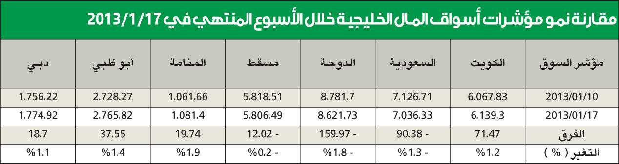الرابحونللمرة الأولى منذ فترة طويلة يقود مؤشر سوق المنامة بقية الاسواق الخليجية الرابحة، وبارتداد قوي بلغ 20 نقطة استطاع مؤشر المنامة ان يقفل عند مستوى 1081.4 نقطة رابحا ما نسبته 1.9 في المئة جاءت بدعم من اربعة قطاعات كان في مقدمتها قطاع الصناعة، وكذلك سجلت تداولات مرتفعة اكثر من نصفها على سهم مصرف السلام البحرين منها 90 في المئة خاصة بقطاع البنوك االذى كان في صدارة اسهمه الرابحة سهم بيت التمويل الخليجي بنسبة زادت عن 8 في المئة.وبعد تراجعات حادة استمرت خلال العام الماضي كان العامل السياسي هو المؤثر الاكبر في تراجعات سوق البحرين تحسن الاداء مع مطلع عام جديد كانت باكورته اجتماع قادة دول مجلس التعاون الاخير ثم بعد ذلك النجاح الجماهيري اللافت لدورة كأس الخليج وهو مؤشر استقرار سياسي بعد احتجاجات مستمرة في المملكة الخليجية الصغيرة.واستمرت مكاسب سوق ابوظبي التدريجية حيث بلغت خلال الاسبوع الماضي 1.4 في المئة هي ثاني اكبر ارتفاع في مؤشر خليجي، استطاع مؤشر سوق ابوظبي ان يحقق نموا بـ37.55 نقطة ليصل الى مستوى 2765.82 نقطة ويؤكد تجاوزه لمستوى 2700 نقطة النفسي القوي مواصلة ارتفاعاته لهذا العام.ودعم التداول المؤسساتي في سوق دبي اداء مؤشر الامارة الخليجية الشهيرة حيث زادت عمليات الشراء خلال الاسبوع الماضي بدعم من استقرار مؤشرات الاسواق العالمية وميل بعضها الى الارتفاع وكذلك كان حال سوق الامارة الخليجية العالمية ليتخطى مؤشر سوقها مستوى 1774.9 نقطة مضيفا 18.7 نقطة هي نسبة 1.1 في المئة. سوق الكويتاستطاعت مؤشرات سوق الكويت للأوراق المالية ان تنهي 4 جلسات من 5 خلال الاسبوع الماضي على اللون الاخضر وكان حجم التراجعات محدودة مقابل مكاسب متدرجة اكملت عقد 1.2 في المئة ارتفاعا على مستوى المؤشر السعري الذي ثبت اقدامه فوق مستوى 6120 نقطة واستطاع ان ينهي الاسبوع عند مستوى 6139.3 نقطة بعد ان ربح 71.47 نقطة، وبذات النسبة ربح مؤشر كويت 15 الذي يقيس اداء اكبر 15 شركة قيمة سوقية والأكثر دورانا حيث اقفل عند مستوى 1046.15 مضيفا 12.82 نقطة، وكانت مكاسب الوزني 1.1 في المئة اي 4.6 نقاط ليقفل عند مستوى 413.17 نقطة.وسجلت حركة التداولات ارتفاعا واضحا على مستوى النشاط وبنسبة 27 في المئة تقريبا مقارنة مع الاسبوع الاسبق، بينما نمت السيولة بنسبة 17 في المئة فقط وتحرك عدد الصفقات مرتفعا بنسبة 21 في المئة، وكانت الثقة عند مستوياتها المرتفعة وهي الداعم الاول لحركة المؤشرات هذا العام والتى لم ير خلالها اللون الاحمر سوى خلال جلسة واحدة هي اقفال جلسة الاثنين الماضي فقط.ومع استقرار المشهد السياسي دون مفاجآت او تجاذب اطمأنت اوساط المتداولين وزادت حركة المضاربة وسط غياب اعلان الشركات القيادية عن بياناتها المالية وتوزيعاتها وهي المحرك الاول لعمليات الشراء الاستثماري بينما زاد الشراء المضاربي وهو ما يشير اليه زيادة حجم التداولات قياسا بسيولتها وبفارق 10 في المئة نموا لصالح النشاط.خاسرونشهد مؤشر سوق الدوحة ضغوط بيعية كبيرة بسبب عمليات جني ارباح كانت منطقية بعد مكاسب كبيرة خلال فترة وجيزة من بداية العام الجديد، وكانت النتيجة خسارة نسبة 1.8 في المئة خلال الاسبوع الماضي عاد بسببها مؤشر الدوحة الى مستويات 8600 نقطة واقفل عند مستوى 8621.73 نقطة تحديدا بعد ان فقد 160 نقطة تقريبا، وكانت نتائج بعض الشركات عذرا جيدا ومنطقيا لعمليات جني الارباح والتصحيح التى يحتاجها مؤشر سوق الدوحة والذي انطلق كالصاروخ منذ بداية هذا العام متخطيا حواجز نفسية وفنية مهمة من المهم التأسيس عندها فنيا.لعبت النتائج المعلنة لحوالي 55 شركة دورا مهما كذلك في تداولات السوق السعودي والذي عانى خلال الاسبوع الماضي لينهي سلسلة مكاسبه والتي صعدت به سريعا فوق مستوى 7 آلاف نقطة ويتذبذب خلال الاسبوع المنصرم تحت هذا المستوى غير ان النهاية كانت لصالح مستوى 7 آلاف نقطة ليقفل تحديدا على مستوى 7036.33 نقطة فاقدا 90.3 نقطة اي نسبة 1.3 في المئة، وينتظر مؤشر «تاسي» اسبوعها مهما حيث اكمال نتائج الشركات التي لم ت
