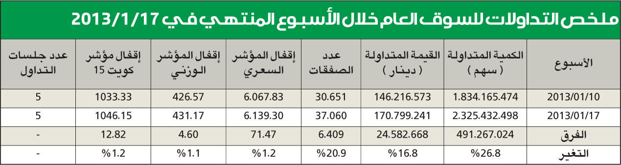 استطاعت مؤشرات سوق الكويت أن تنهى 4 جلسات من 5 خلال الأسبوع الماضي على اللون الأخضر، وكان حجم التراجعات محدوداً مقابل مكاسب متدرجة بلغت 1.2 في المئة ارتفاعاً على مستوى المؤشر السعري.