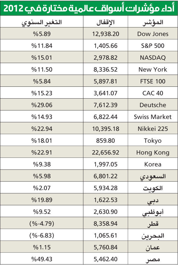 تبقى الماكينة الالمانية تدور دون توقف وبقوة افضل مما كانت عليه خلال الاعوام الاربعة الماضية التي عكسها مؤشر السوق الالماني الافضل اداء بين اسواق المال الغربية، حيث حقق 29 في المئة ليقفل عند مستوى 7612.3 نقطة وهو لا شك يعكس متانة الاقتصاد الالماني الذي كان الاقل تأثرا بين الاقتصادات العالمية بالازمة المالية العالمية، وبالرغم من مساهمته الفاعلة في دعم منطقة اليورو وتحمل تبعات عثرات دول في المنطقة إلا انه بقي الافضل من حيث المكاسب محققا رقما صعبا خلال عام واحد.شرق آسيا ومكاسب نيكيكان اداء مؤشر نيكي الياباني من افضل المؤشرات الآسيوية ولم يتجاوزه عالميا سوى الالماني، وبعد تسونامي رهيب اجتاح مناطق شاسعة من ارخبيل الجزر اليابانية دمر ما دمر وأوقف محطات توليد كهرباء نووية ضخمة عاد الاقتصاد الياباني الى سابق عهده وبهمة وإدارة لا تقهر عكسها اداء سوقه المالي بمكاسب بلغت 22 في المئة لم ينافسه آسيويا سوى سوق هونغ كونغ بمكاسب مقاربة، ولم يبق من اثر لتسونامي وبقيت الديون السيادية اليابانية الاعلى عالميا من حيث نسبتها الى الناتج المحلى الاجمالي.السعودي وارتباط عالميتساوت مكاسب مؤشرات داو جونز الاميركي وفيتسي 100 البريطاني و»تاسي» السعودي حيث ربح الاثنان الأولان 5.8 في المئة بينما كانت مكاسب مؤشر السوق السعودي حوالي 6 في المئة مقفلا عند مستوى 6801 نقطة قريبا جدا من مؤشرات اميركية وبريطانية، وكان التذبذب سمة سائدة حيث بلغ داو جونز اعلى مستوياته خلال خمسة اعوام بعد ان تخطى اقفالات ما قبل الازمة المالية العالمية بعد ان اقفل على مستوى 13500 نقطة ثم تراجع بعد ذلك لكنه بقي قريبا من اعلى مستوياته وعلى عكس السعودي الذي تراجع من اعلى مستوياته واقفل على منطقة وسطى بين قاعه وقمته خلال عام 2012.دبي الأفضل خليجياً عكس مؤشر سوق دبي المالي اداء اقتصاد الامارة عام 2012 وبعد ازمة ديون عصفت بأشهر امارة خليجية وأكثرها انفتاحا عام 2009 وفي اعقاب ازمة مالية عالمية طاحنة، استطاعت دبي تجاوز الازمة بنجاح وبفضل دعم من امارة ابوظبي لتسجل انتعاشا سياحيا وعقاريا لافتا خلال عام 2012 وقد ساعد اقفال مناطق سياسية عربية بعد ازمة الربيع العربي على دعم النمو السياحي حيث اصبحت منافسا سياحيا وحيدا ليستفيد اقتصادها بشكل واضح وترتفع وتيرة نمو شركاتها، كما اصبحت منطقة جذب استثماري لمستثمرين اجانب يجوبون العالم بحثا عن فرص واستثمارات في قيعانها، واقفل مؤشر سوق دبي المالي على مستوى 1622.5 نقطة رابحا 19.89 في المئة هي اكبر مكاسب خليجية خلال عام 2012.وجاء ابوظبي ثانيا من حيث المكاسب بعد ان اقفل عند مستوى 2630.9 نقطة رابحا 9.5 في المئة وسط استقرار بيئته السياسية والاقتصادية مما انتج اقتصادا جيد النمو وبنظرة مستقبلية مستقرة مدعوما باستقرار اسعار النفط التي بقيت فوق مستوى 100 دولار معظم فترات العام الماضي.وسجل سوقا الكويت وعمان استقرارا على مكاسب محدودة بعد تذبذب حاد خلال العام بلغ حوالي 7 في المئة ليقفل مؤشر سوق الكويت السعري على ارتفاع لم يتجاوز 2 في المئة عند مستوى 5934 نقطة، بينما جاءت مكاسب السوق العماني بنسبة 1.1 في المئة فقط ليقفل عند مستوى 5760.8 نقطة ربحها خلال شهر ديسمبر الماضي.خسائر في الدوحة والمنامةرغم اختلاف بيئتهما الاقتصادية والسياسية فإن الخسارة كانت قاسما مشتركا بينهما، وكان السوق القطري يمر بمرحلة تصحيح بعد مكاسب عام 2011 التي كانت الاكبر خليجيا وذلك عقب فوز دولة قطر بحق تنظيم كأس العالم 2022 مما بث تفاؤلا مفرطا ومبكرا جدا في سوقها ليسجل مكاسب كبيرة. وبعكس اداء الاسواق الخليجية خلال عام 2011 جاء اداء 2012 لسوق الدوحة مسجلا خسارة بنسبة 4.85 في المئة تقريبا.ولأسباب معروفة جلها سياسية كانت خسارة سوق المنامة هي الاشد وذلك رغم مكاسب شهر سبتمبر الكبيرة التي اعقبت عقد اجتماع قيادات مجلس التعاون في المنامة والتي دعمت الثقة وقلصت خسائر سوق المنامة الى مستوى 6.8 في المئة، ويبقى التحدي الاكبر لبيئة تشغيل الشركات القيادية في سوق المنامة عام 