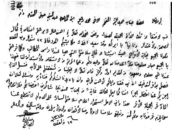 "حضرة جناب العالي الجاه ذو الشوكة والإجلال الجناب الكرنل (الكولونيل) ميد باليوز وقونسل (قنصل) جنرال الدولة البهية القيصرية في خليج فارس المفخم دام مجده آمين،بعد السلام والسؤال عن صحة ذاتكم العلية لا زلتم في خير وعافية. ولا يخفى سعادتكم بالنسبة لكتابنا نمبر (رقم) 331 المؤرخ في 3 ذي القعدة الحرام سنة 1316 مطابق 15 مارج سنة 1899 المرسول لحظرتكم (حضرتكم) في سمبوك غلام حسين صحبة النوخذا زاير علي، المشروح فيه المذاكرة فيما بيننا وصديقنا (أي الشيخ مبارك) المعلوم عندكم، نرجو الله وصلكم وحطتم به علما، ولا يخفاكم (يخفى عليكم) أن من بعده بيوم واحد وصلنا منه كتاب صحبة شخص من طرفه يسما (يسمى) خليل بن ابراهيم وبجوفه شفتين شارحا فيهم المواد التي ستطلعون عليها، وهم واصلين لحظرتكم (حضرتكم) لفا، فلأجل ذلك عمدنا ماشوة (سفينة صغيرة) مخصوصة وفيها خادمنا عبدالرحمن الوزان بكتابنا هذا ونرجو ان فيما سرع يرجع بالجواب منكم، وبحسب امركم نعمل. هذا ما لزم عرضه ودمتم محروسين والسلام.حرر في 5 ذي القعدة سنة 1316 مطابق في 17 مارج 1899.صحيح محمد رحيم بن عبدالنبي صفر" وفي تاريخ 12 ذو القعدة 1316 الموافق 24 مارس 1899م، كتب الشيخ مبارك الصباح رسالة إلى الوكيل الإخباري البريطاني في البحرين يفيده فيها بتسلم رسالتيه الأخيرتين (تاريخهما 22 شوال و3 ذو القعدة) وأنه قرأهما وكان سعيداً بمضمونهما الذي يشير إلى موافقة الدولة البريطانية على حماية الكويت على أساس الاتفاقية الموقعة بينهما. وإليكم نص الرسالة:"باسم الله تعالى،،حضرة جناب حميد الشيم المفخم الأخ محمد رحيم ابن المرحوم عبدالنبي صفر المحترم دام بقاه،،غب الافتقاد عن تلك الذات الحميدة الصفات، ونحن نحمد الله تعالى في أحسن حال لا برحتم ان شاء الله في كمال الصحة والاعتدال،وثانيا بأبرك وقت سعيد أخذت مكاتيبكم المؤرخات 22 شوال و3 ذو القعدة تلونا الجميع بغاية الأفراح، حيث أنبأتنا عن غالي سلامتكم التي هي عندنا رأس المطالب، وكما شرحتم بالجميع صار معلومنا، فلا أعدمنا الله تعالى وجودكم. وعما أشرتم من الاستقامة والاستدامة فهذا عندنا شيء معلوم ومعهود من القديم أولا وآخرا، فالله تعالى لا يخلينا من شفقتكم الى الأبد. فنسأل الذي خصكم بوافر التوفيق أن يوفقنا وإياكم لأحسن طريق، وأن يؤيدنا. نشكركم (... كلمة غير مقروءة)، ونسأله تعالى أن يجزيكم عنا افضل الجزا (الجزاء). اننا كما يعلم الخالق غاية من الجناب ممنونين، شاكرين أفضالكم فلا أعدمكم الله المآثر الجميلة الاثر. هذا وإن الأمل استمرار إعلام سلامتكم السارة على الدوام، لا تقطع عنا مما يلزم شرفونا به...ونبلغ سلامنا للأولاد ومنا الإخوان والأولاد يسلمون ودمتم سالمين، والسلام 12 ذوالقعدة 1316 مبارك الصباح"وعبدالرحمن الوزان الذي ذكرته الوثيقة هو عبدالرحمن بن أحمد الوزان المولود في فريج الفاضل بمدينة المنامة عام 1870م، وكانت لديه سفينة شراعية اسمها "عبرة"، وتوفي في عام 1950م.