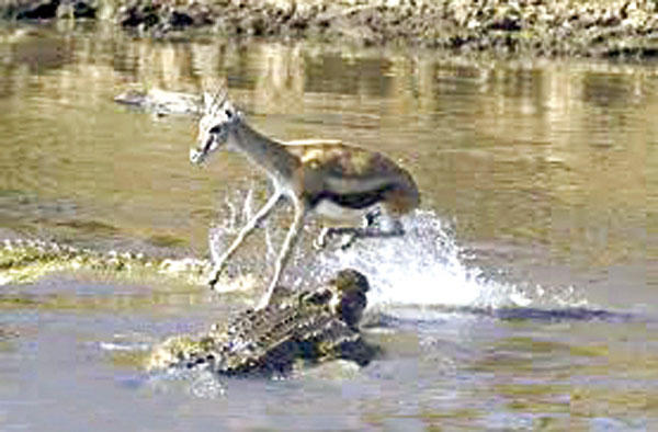 دفع غزال صغير حياته ثمناً لعبور نهر في كينيا، حين قفز إلى أعلى قفزته الأخيرة، ليهبط في فم تمساح ضخم مفتوح ومستعد للغزال، ضمن فخ من التماسيح المنتظرة.ووصفت صحيفة "ديلي ميل" البريطانية الغزال الصغير بـ"الساذج"، لأنه اختار عبور نهر "مارا" الكيني في بقعة تكتظ بالتماسيح، ليصبح في النهاية وجبة لها.