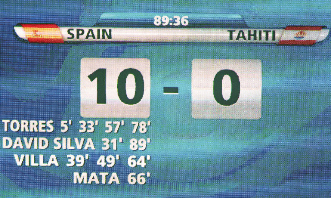 دك المنتخب الإسباني بطل العالم أوروبا شباك منافسه التاهيتي المتواضع بعشرة أهداف بلا مقابل على ملعب ماراكانا الشهير في ريو دي جانيرو ضمن منافسات الجولة الثانية من المجموعة الثانية لكأس القارات.وسجل فرناندو توريس (5 و33 و57 و78) ودافيد سيلفا (31 و89) ودافيد فيا (40 و49 و64) وخوان ماتا (66) الاهداف.