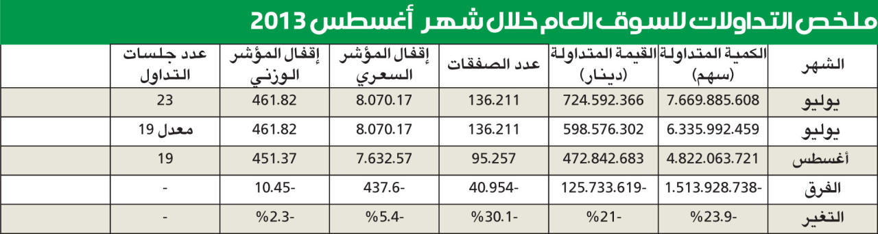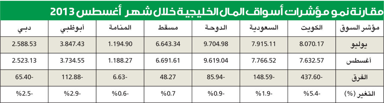 تقرير أسواق المال الخليجية لشهر أغسطس: تراجع جماعي بصدارة «الكويتي»... و«مسقط» الرابح الوحيد